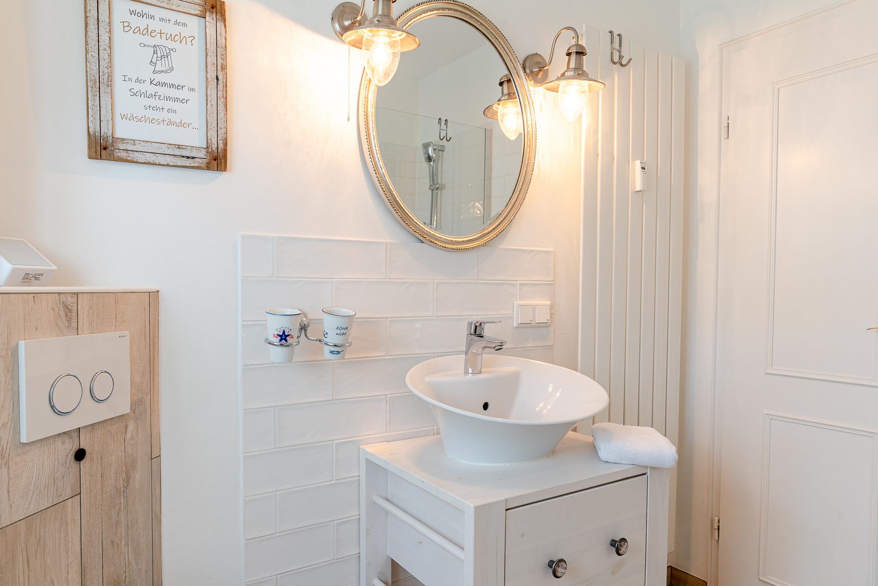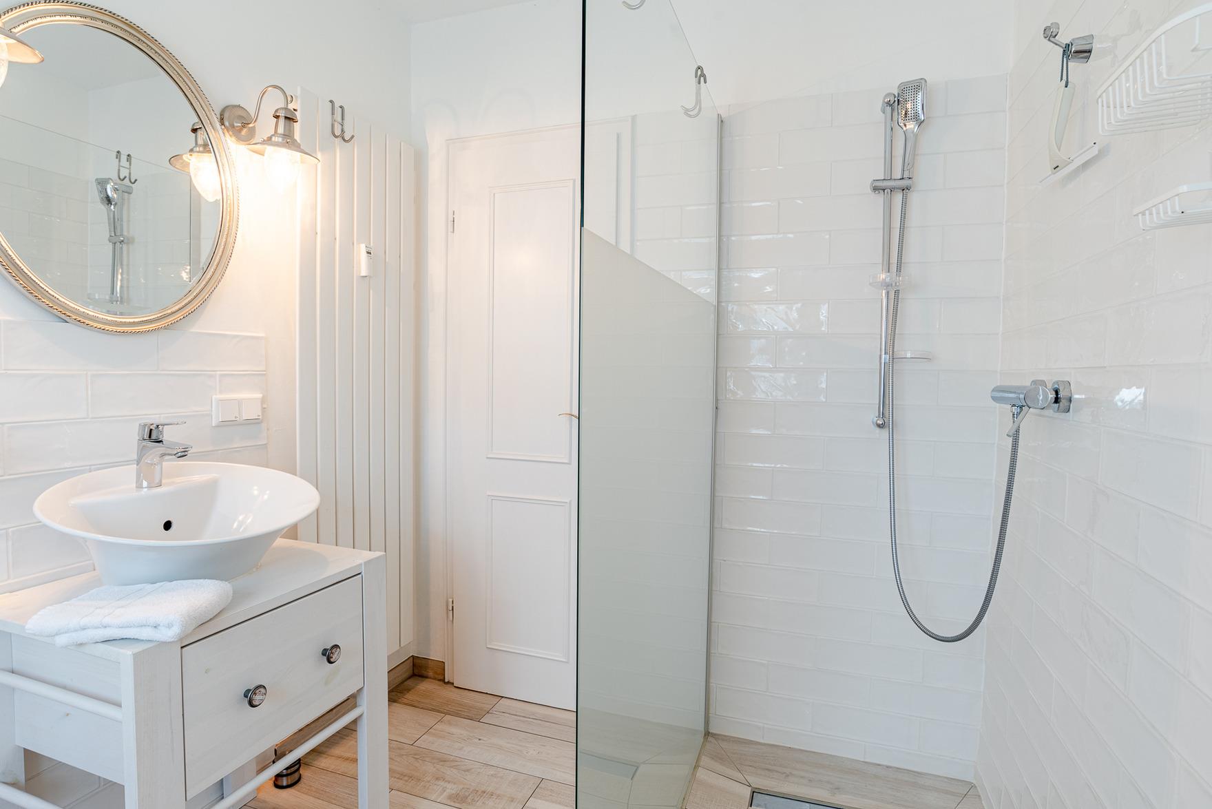 In dem Badezimmer befindet sich eine ebenerdige Dusche.