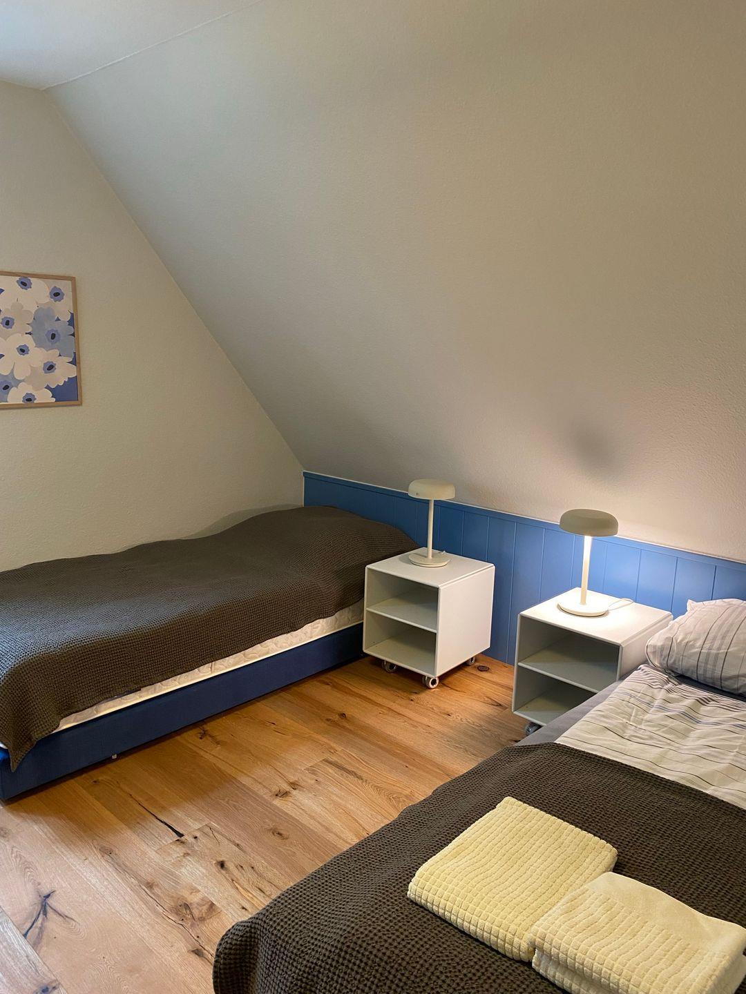 Mit einer Wohnfläche von etwa 95 qm bietet Ihnen diese Unterkunft einen einladenden Eingangsbereich mit Garderobe, ein Schlafzimmer mit einem komfortablen Doppelbett (180x200), ein weiteres Schlafzimmer mit zwei Einzelbetten (90x200), zwei Duschbäder sowie ein Gäste-WC. Der offene Küchenbereich mit Essplatz und der helle Wohnbereich stehen Ihnen ebenfalls zur Verfügung.