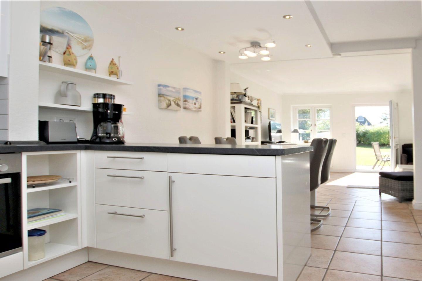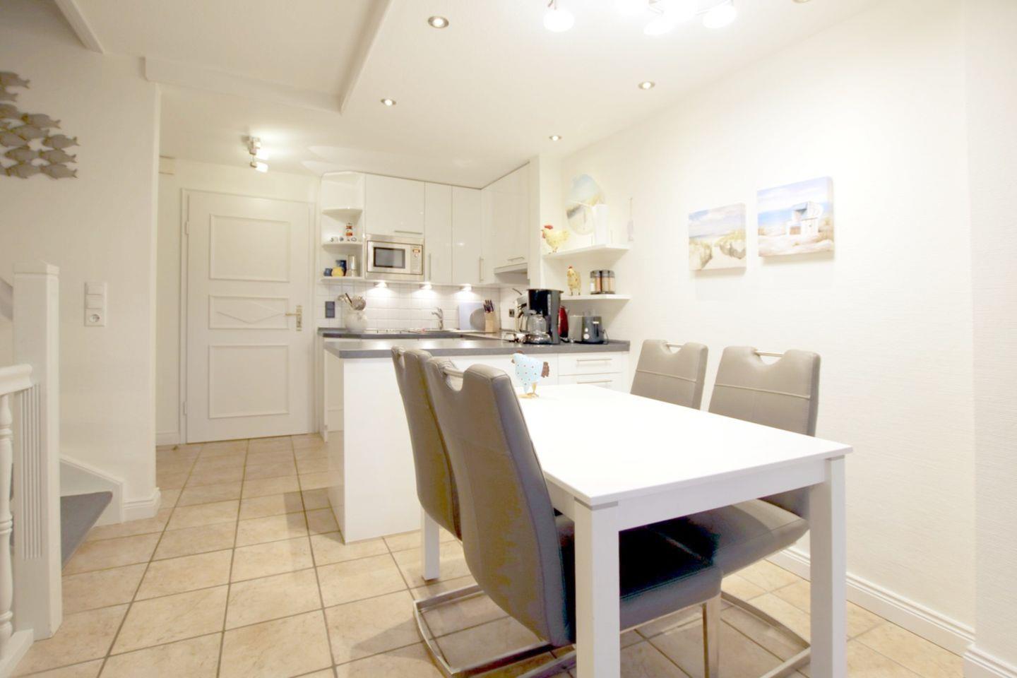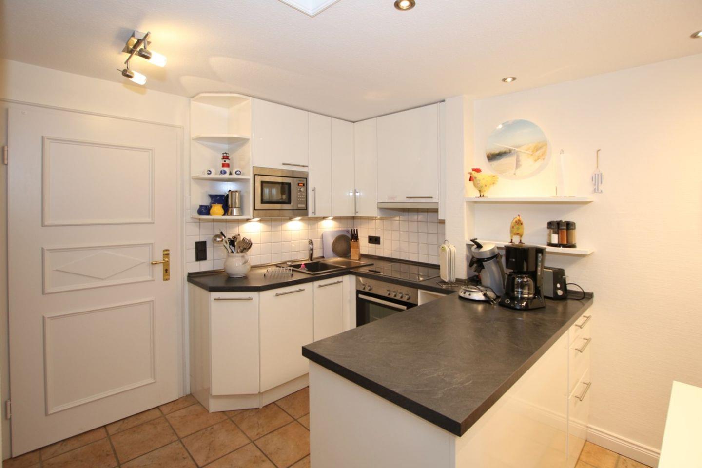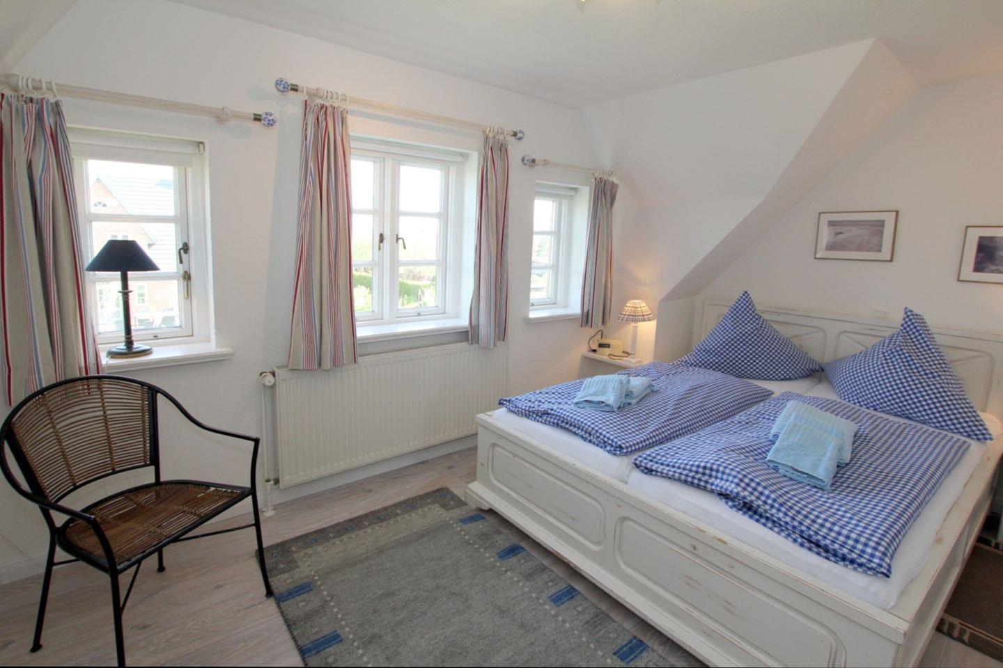Friesenhausteil in Wrixum auf Föhr, Karkstieg 6, Nr. 2: Gemütliche 3-Zimmer Reihenhausscheibe. NICHTRAUCHERHAUS. Vom DTV mit 4 Sternen ausgezeichnet. WOHNZIMMER: mit 2,5 er Couch, 2 Sesseln, Kaminofen. KÜCHENZEILE: Komplett ausgestattet mit Essplatz für 5 Personen. Gäste/WC im EG. Eingangsflur. Im 1 OG befindet sich das BAD 1: Dusche/WC. SCHLAFZIMMER 1: Doppelbett und Einbauschrank. SCHLAFZIMMER 2 mit Doppelbett und eingebautem Kleiderschrank. Die beiden Schlafzimmer im 1.OG und der Flurbereich sind mit Design-Echtholzparkett ausgelegt. Im Untergeschoss befindet sich ein weiteres BAD 2 mit Dusche/WC. Im Erdgeschoss befindet sich ein weiteres WC. Das Haus hat für die 3 Hausteile eine Gemeinschaftssauna auf Münzbasis und Waschmaschine und Trockner mit Münzer. Die Haushälfte ist ruhig gelegen. Das Zentrum vom Wyk erreichen Sie in ca. 20 - 30 Min. Fußweg. Zum Strand sind es mit dem Fahrrad ca. 10 - 15 Minuten. Ein Bäcker ist in der Nachbarschaft. Bettwäsche und Handtücher werden inklusive gestellt. Parkplatz am Haus. Das Haus wurde mit sehr viel Liebe zum Detail ausgestattet und bietet mit der Terrasse und dem Garten viel Platz zum Wohlfühlen und Entspannen.