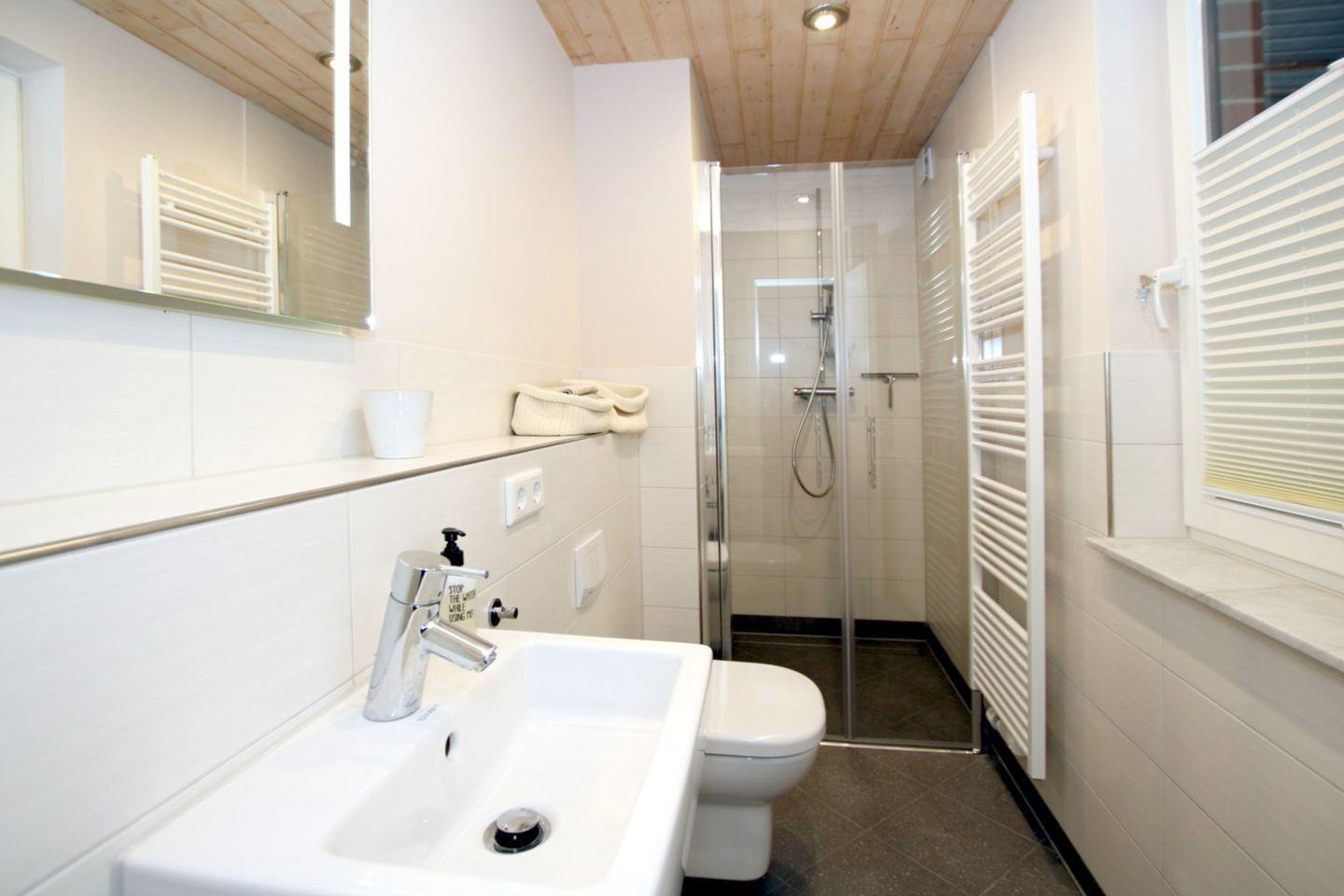 Im 1.OG befinden sich zwei weitere Schlafzimmer. Das eine mit zwei Einzelbetten, Sitzecke und Kommode und das andere mit Doppelbett (1,80x2,00m), SAT-TV(Smart-TV) und Einbauschrank. Bad 3 im 1.OG mit großer Dusche und WC.