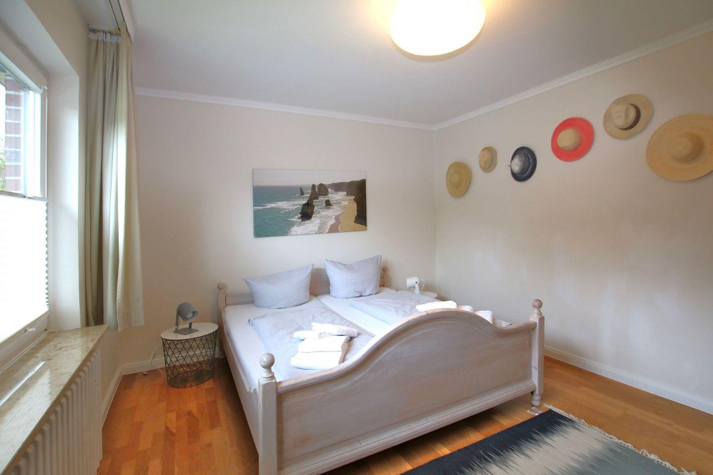 Schlafzimmer 1 im EG mit Doppelbett (1,80x 2,00m) und Kleiderschrank. Schlafzimmer 2 im EG mit Doppelbett(1,60 x 2,00m) und Kleiderschrank. Bad 1 im EG mit Dusche und WC. Bad 2 im EG mit Badewanne, WC und Doppelwaschbecken. Außerdem befindet sich im EG noch ein Arbeitszimmer mit Schreibtisch und Couch.