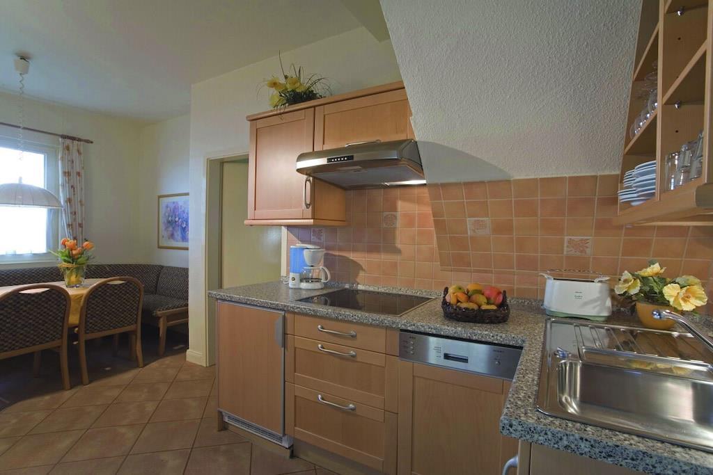 Die Wohnung für 2 Personen liegt im Erdgeschoss und ist 35 m² groß. Sie verfügt über ein Schlafzimmer mit Doppelnbett und Kleiderschrank, eine Küchenzeile sowie ein Duschbad. Die Küchenzeile im Wohn-/Esszimmer verfügt über Dunstabzugshaube, Herd, Mikrowelle, Geschirrspüler und Geschirr. Der Wohnbereich lädt mit dem gemütlichen Sofa zu entspannten TV-Abenden ein. Eine PKW Stellmöglichkeit befindet sich am Haus. Hier finden Sie außerdem die Gemeinschaftsterrasse mit Gartenmöbeln und Strandkörben.