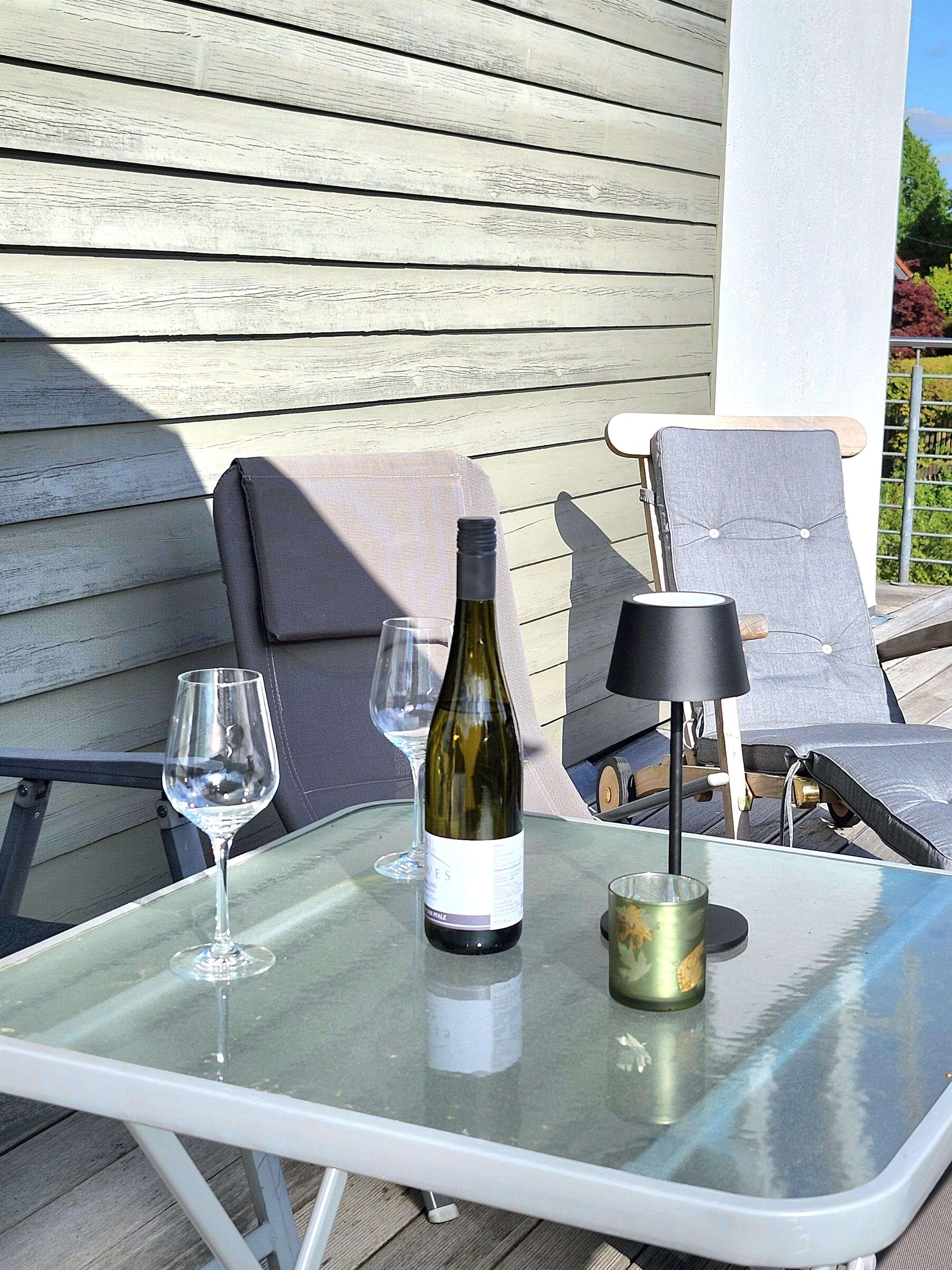 Nach der Aktivität lädt die große nach Süd-West ausgerichtete Terrasse zum Entspannen auf Liegestühlen oder zu einem abendlichen Glas Wein am Terrassentisch ein.