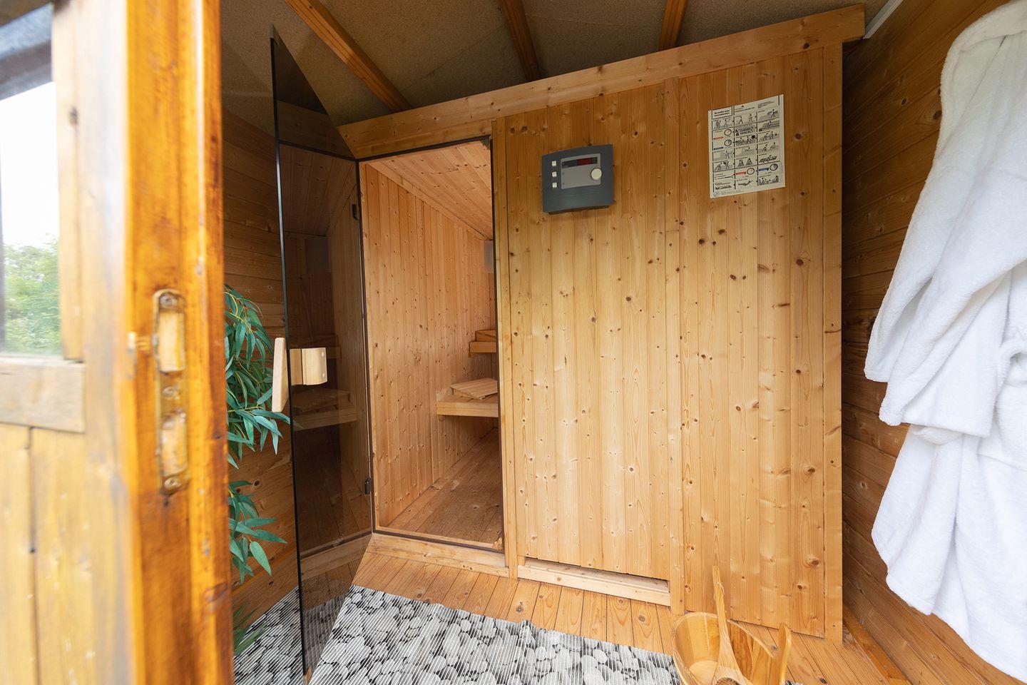Die Sauna im Garten gehört zu den Dingen, die man beim Buchen vielleicht kurz überliest und dann doch jeden Abend nutzt. Terrasse, Grill und sechs Sitzplätze sind dabei.