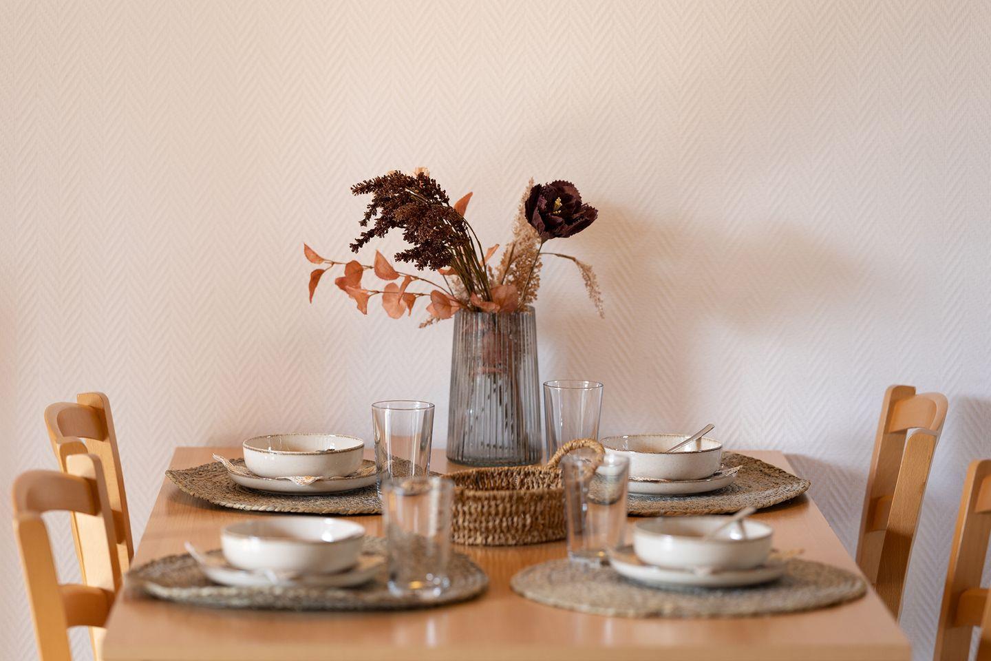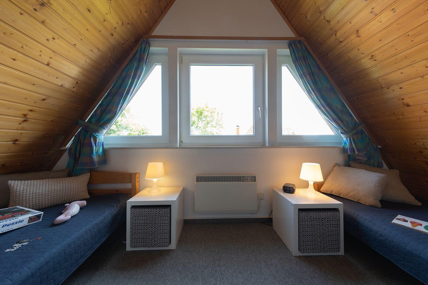 Im Wohnbereich mit Laminatboden sorgen Sofaecke, Essplatz, WLAN, zwei Fernseher, DVD- und CD-Player sowie Gesellschaftsspiele für Komfort und Unterhaltung. Die offene Küche ist voll ausgestattet: Ceranfeld, Spülmaschine, Backofen, Mikrowelle, Kühlschrank mit Gefrierfach, Kaffeemaschine und mehr. Zwei Schlafzimmer mit Teppichboden, ein Babybett, Hochstuhl und Treppengitter machen das Haus familienfreundlich.