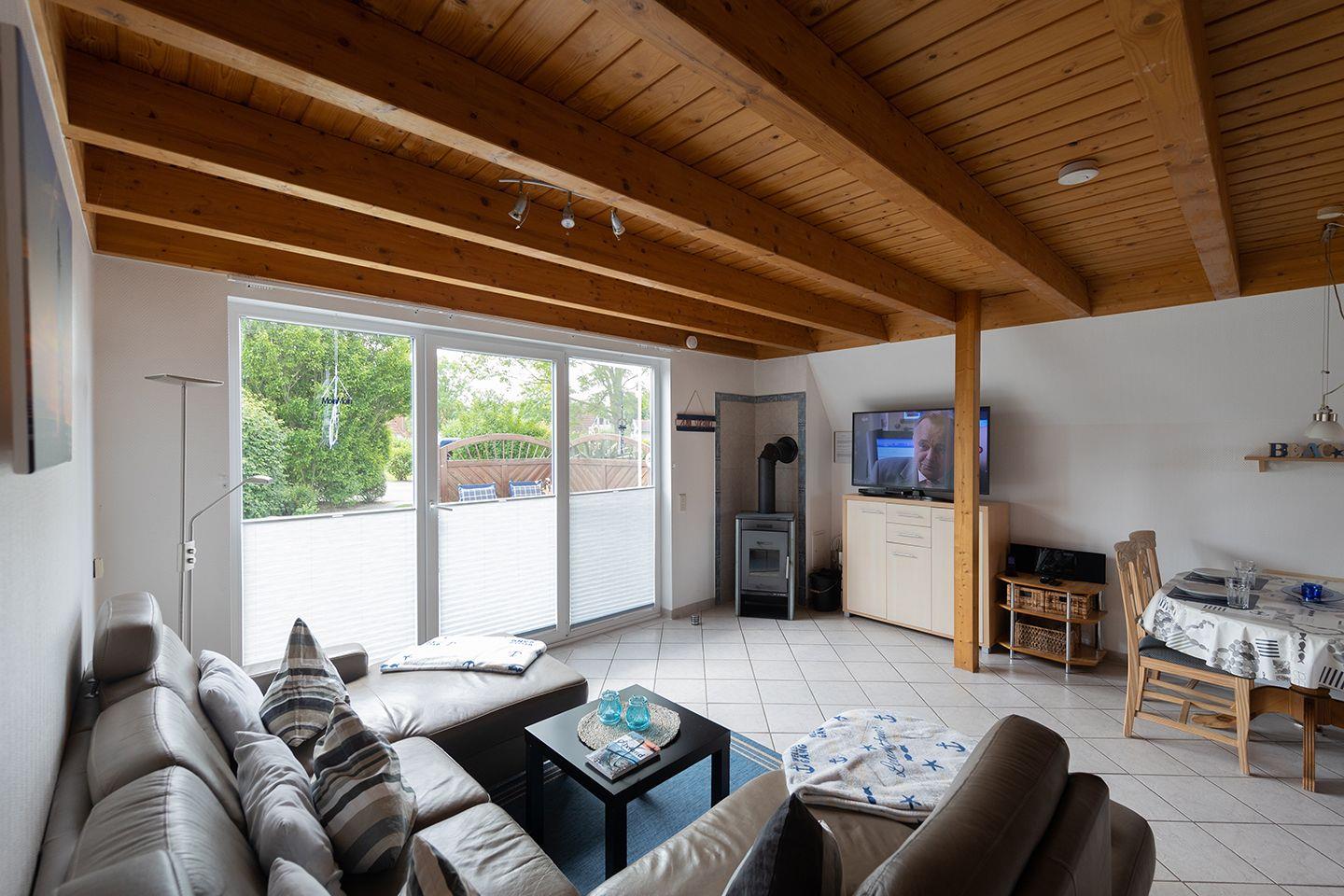 Wenn der Tag draußen beginnt und abends beim Kartenspielen endet, ist das Ferienhaus „Ebbe & Flut“ in Dorum-Neufeld genau richtig. Auf zwei Etagen bietet es 61 m² Wohnfläche mit zwei Schlafzimmern, einem Wohnbereich mit Kaminofen und einer voll ausgestatteten Küche mit Spülmaschine, Mikrowelle und Backofen, praktisch für den Familienalltag.