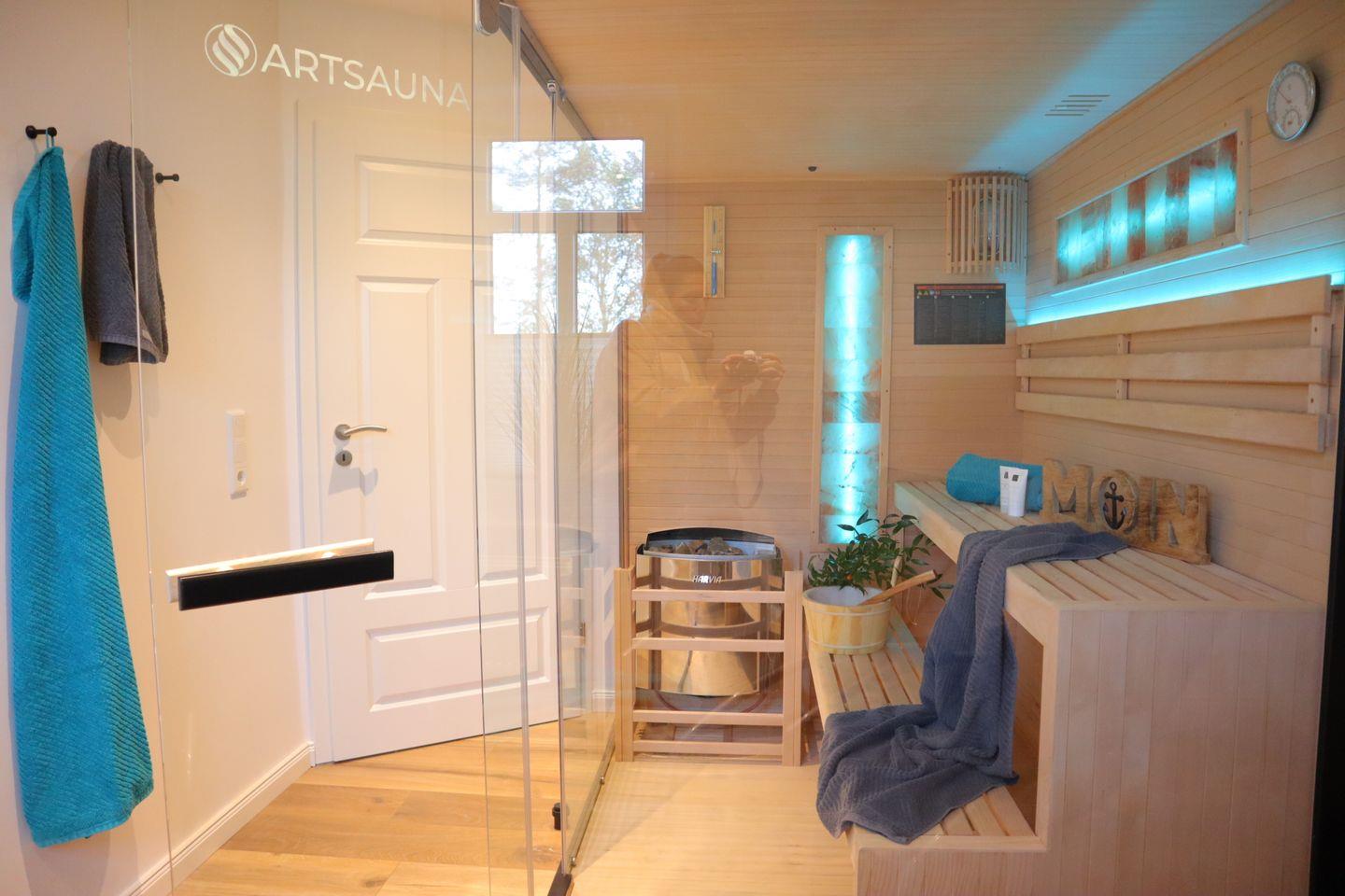Zwei elegant gestaltete Bäder und eine private Sauna vervollständigen das Wohlfühlkonzept auf luxuriöse Weise.