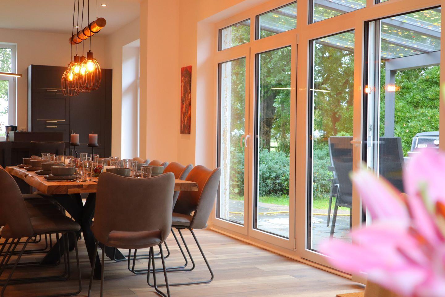 Große Fensterflächen öffnen den Blick in den weitläufigen Garten, der von einer sonnigen Terrasse und einem geschmackvoll eingezäunten Außenbereich umgeben ist – perfekt zum Entspannen und Durchatmen.