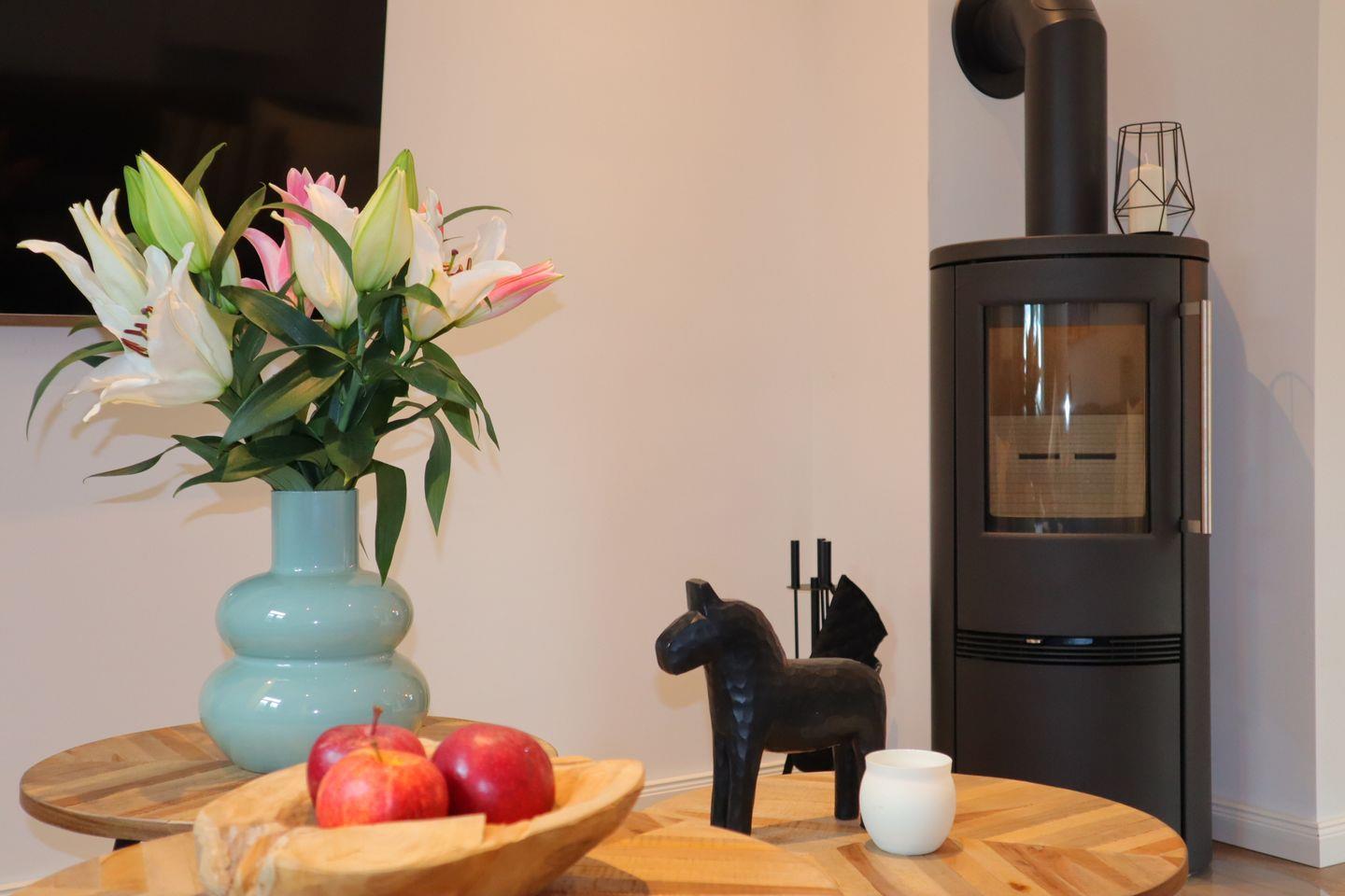 Der Kamin bildet das Herz des Hauses – ein Ort, an dem man gerne zusammen kommt um den Abend bei sanftem Licht ausklingen zu lassen. Die moderne, hochwertig ausgestattete Küche fügt sich nahtlos in das Ambiente ein und schafft Raum zum gemeinsamen Genießen.