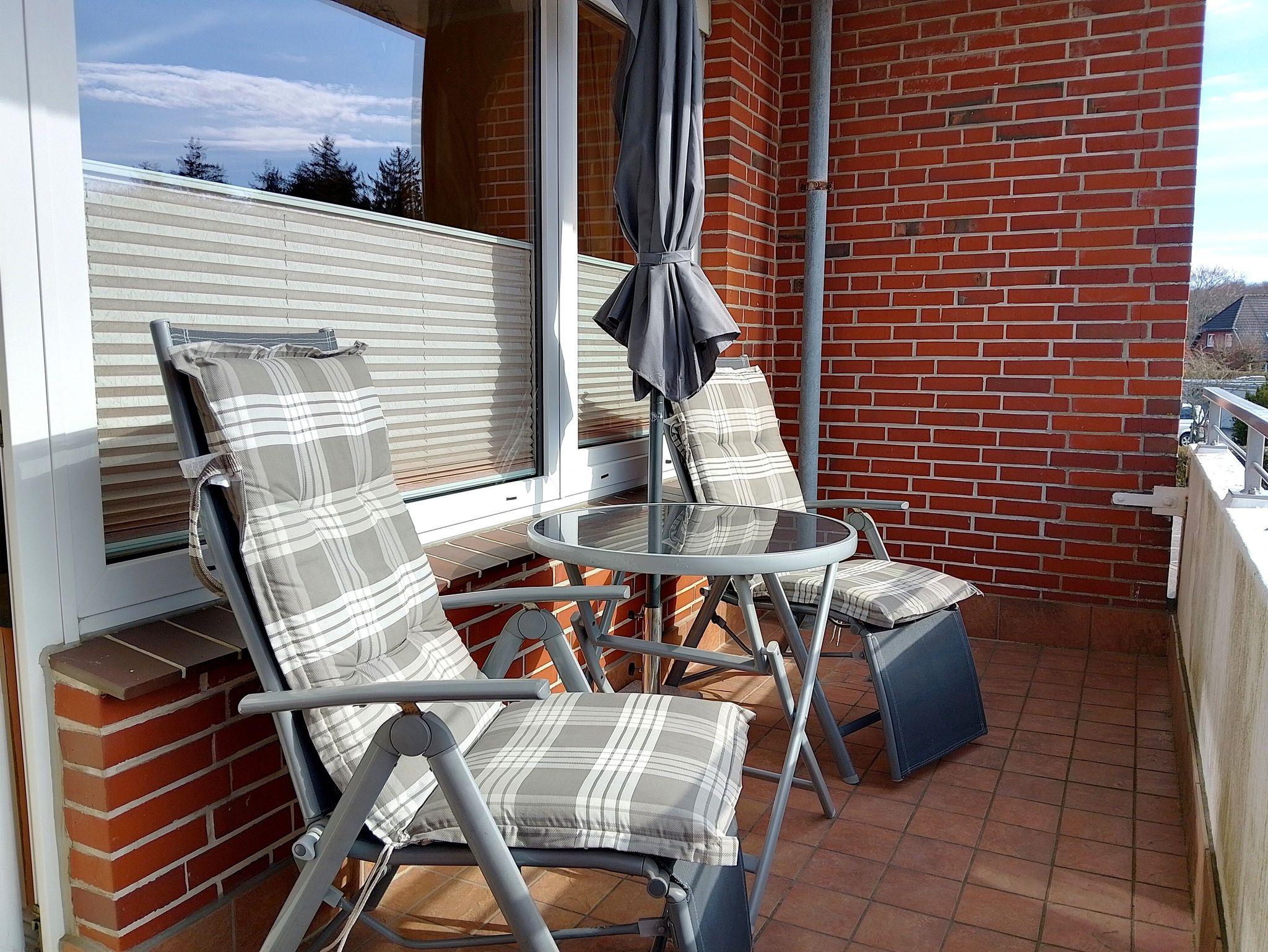 Außenbereich: Balkon, Balkonmöbel, Parkplatz.