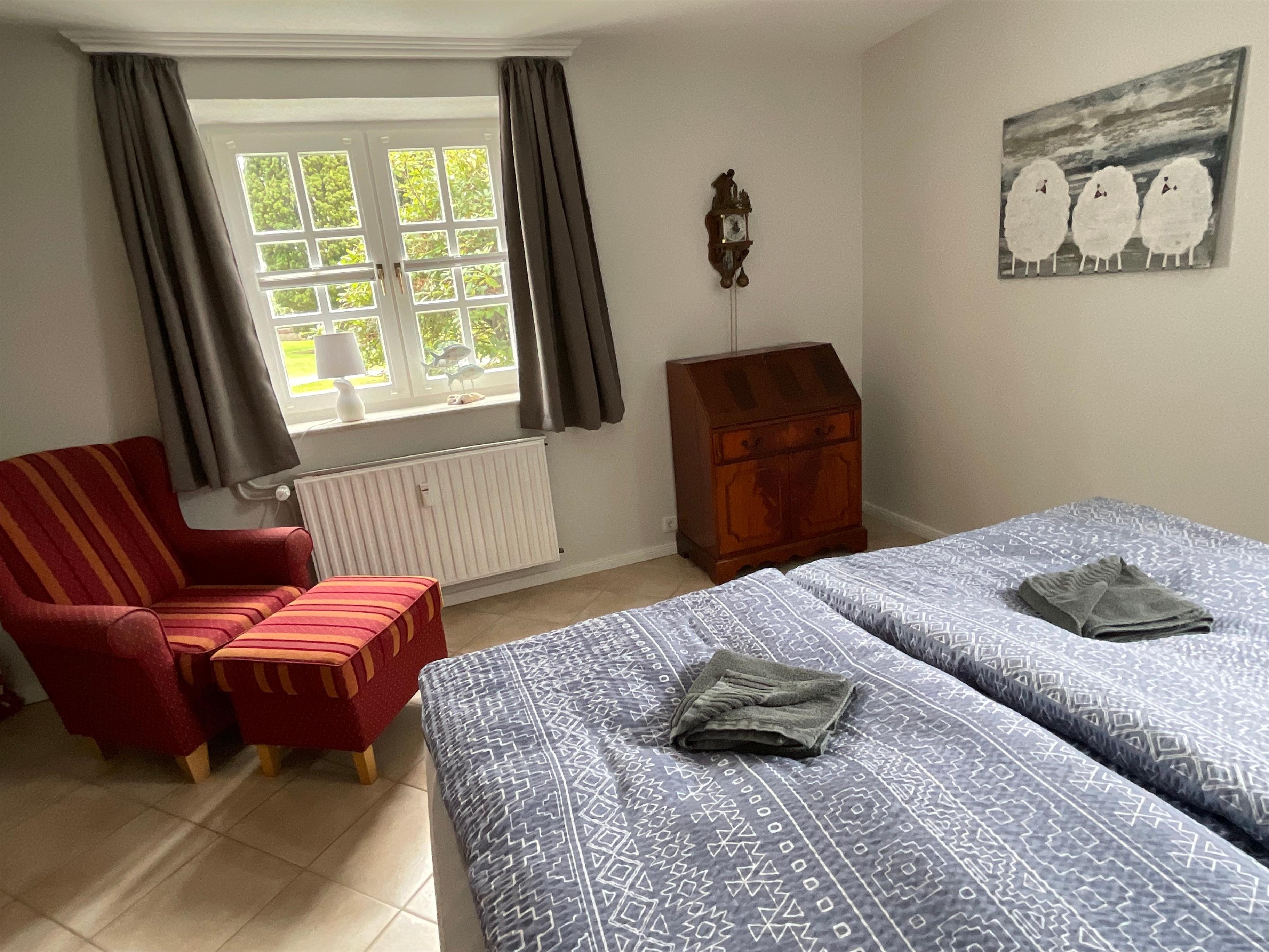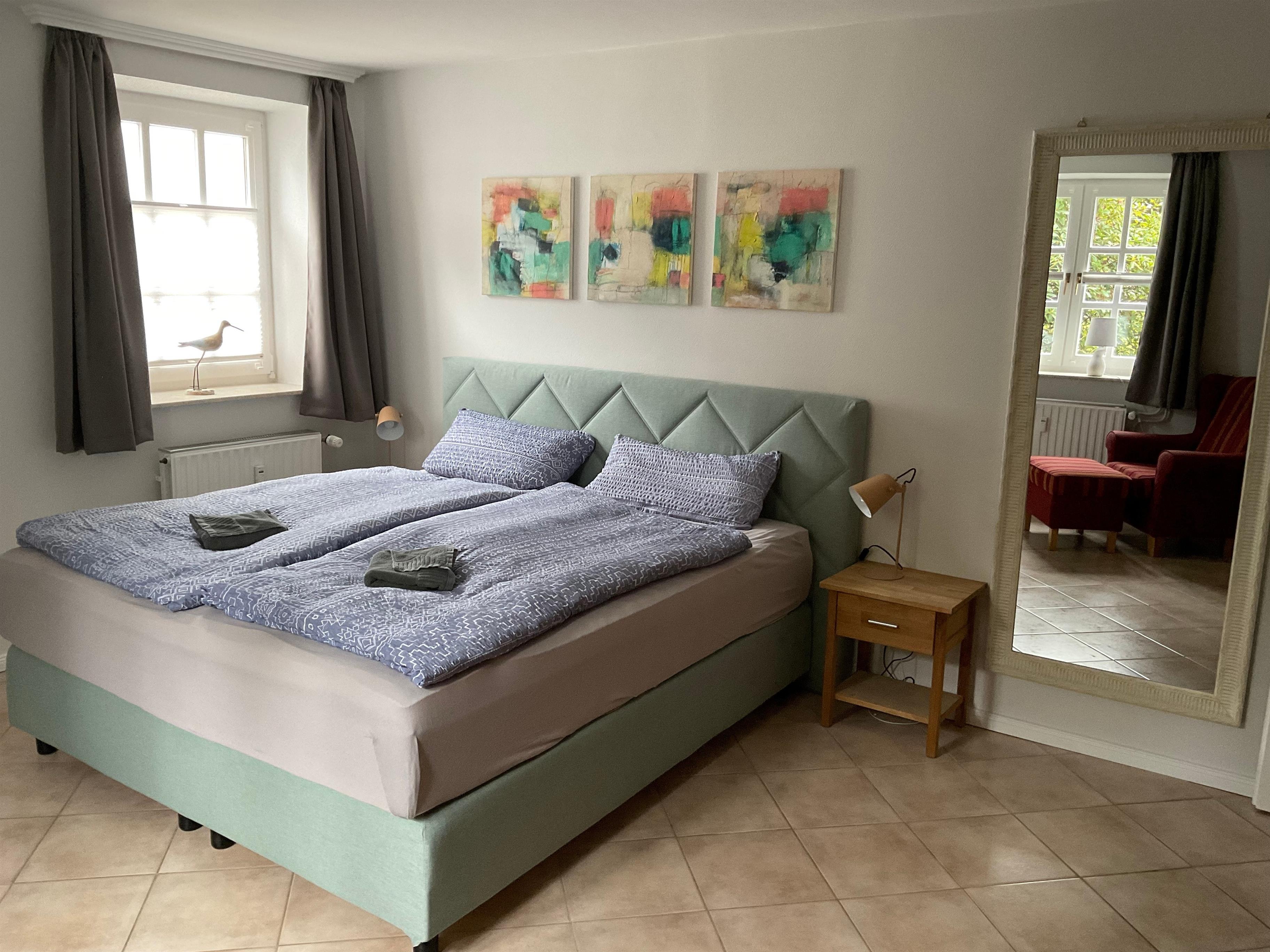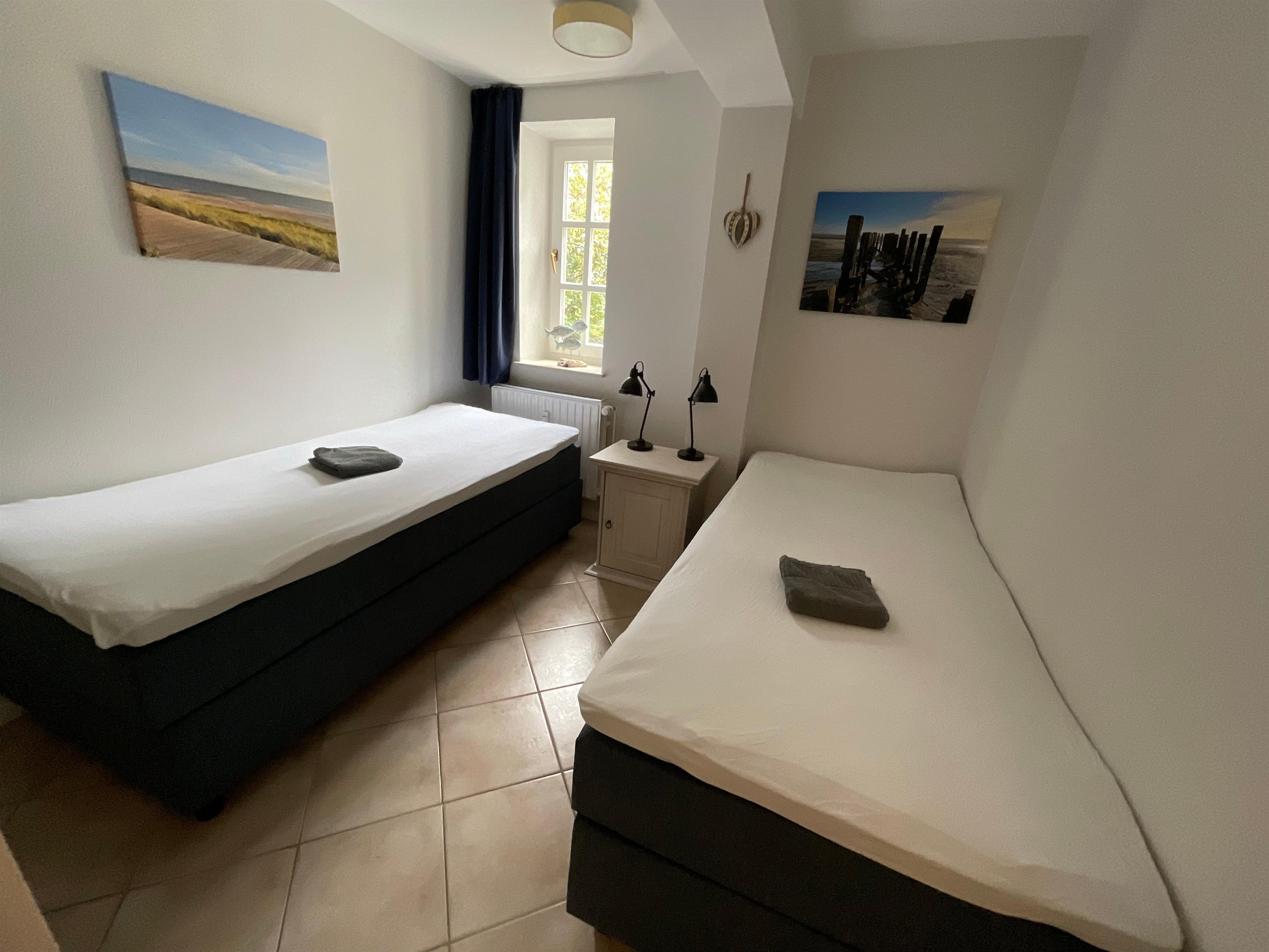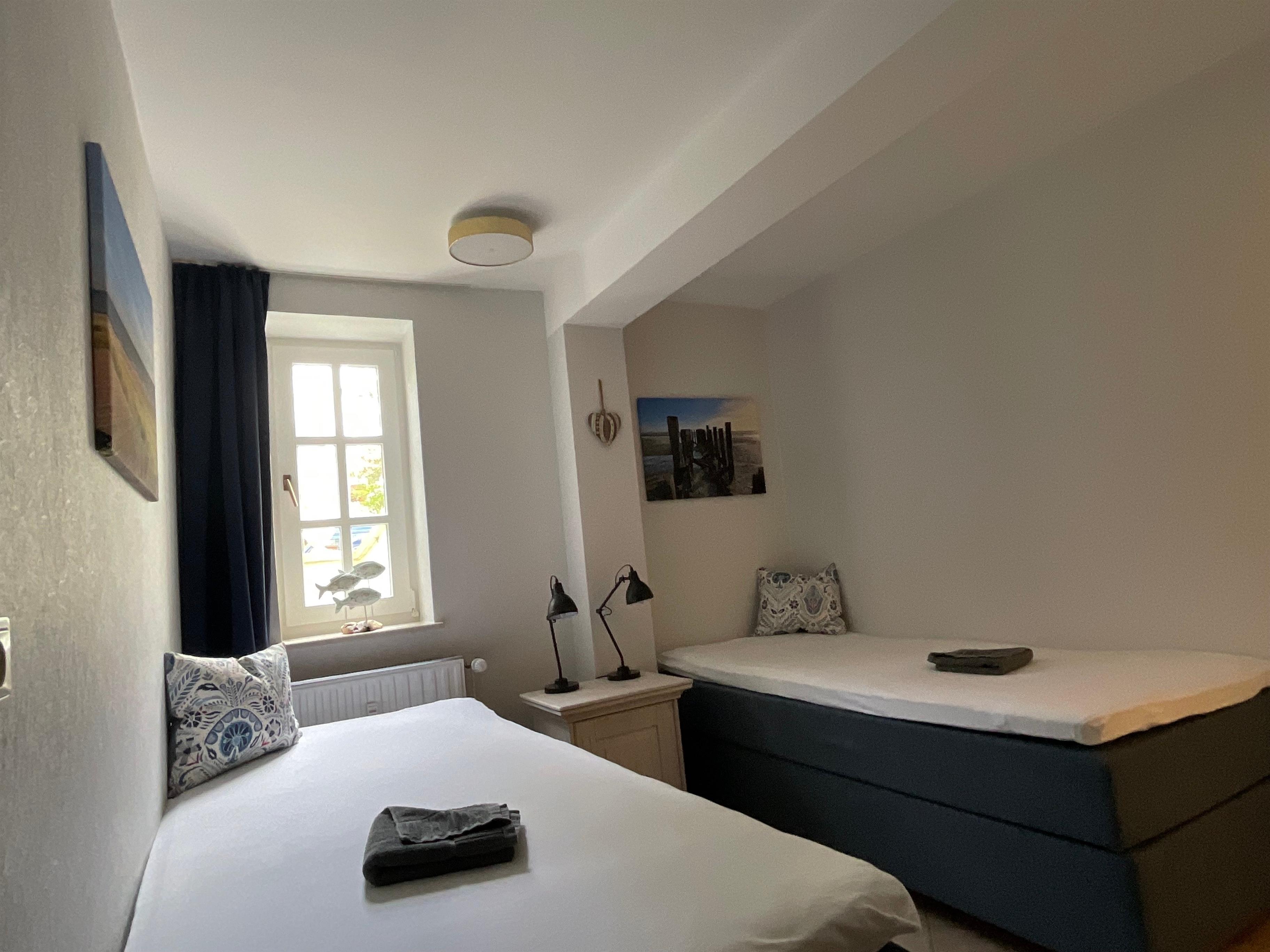Das Größere(19 m²) hat eine Doppelbett(180x200cm) und das Kleinere(10 m²) zwei Einzelbetten(jeweils 90x200cm).