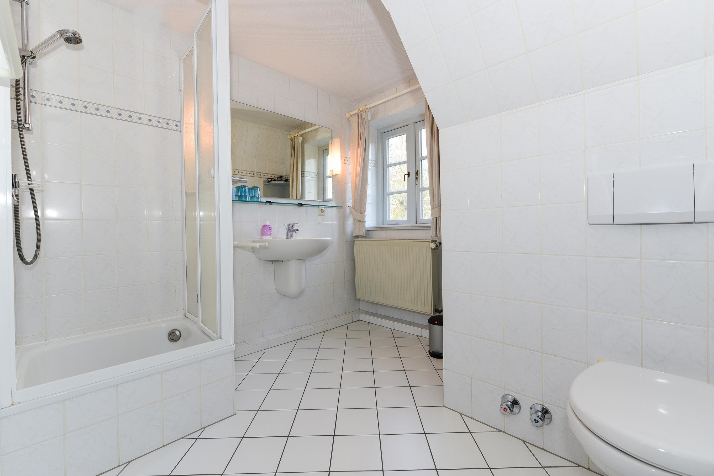 Im Obergeschoss finden Sie ein großes Vollbad mit Wanne, Dusche und WC sowie ein zusätzliches Duschbad.