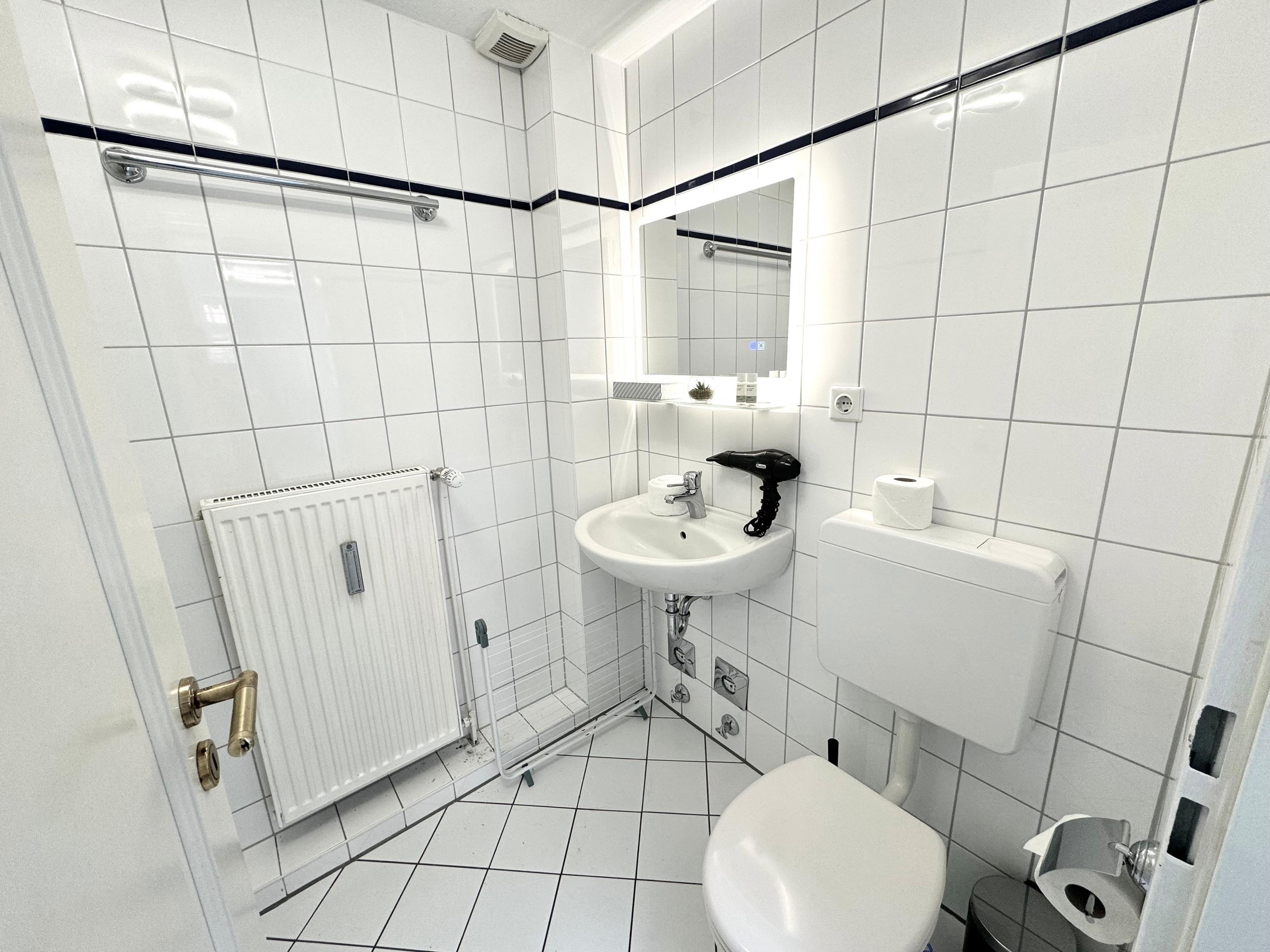 In dieser Ferienwohnung befindet sich ein modernes Schlafzimmer mit Boxspring-Doppelbett und SAT-TV. Ebenso vom Flur ausgehend erreichen Sie das Wannenbad mit Bade- und Duschamatur und WC.