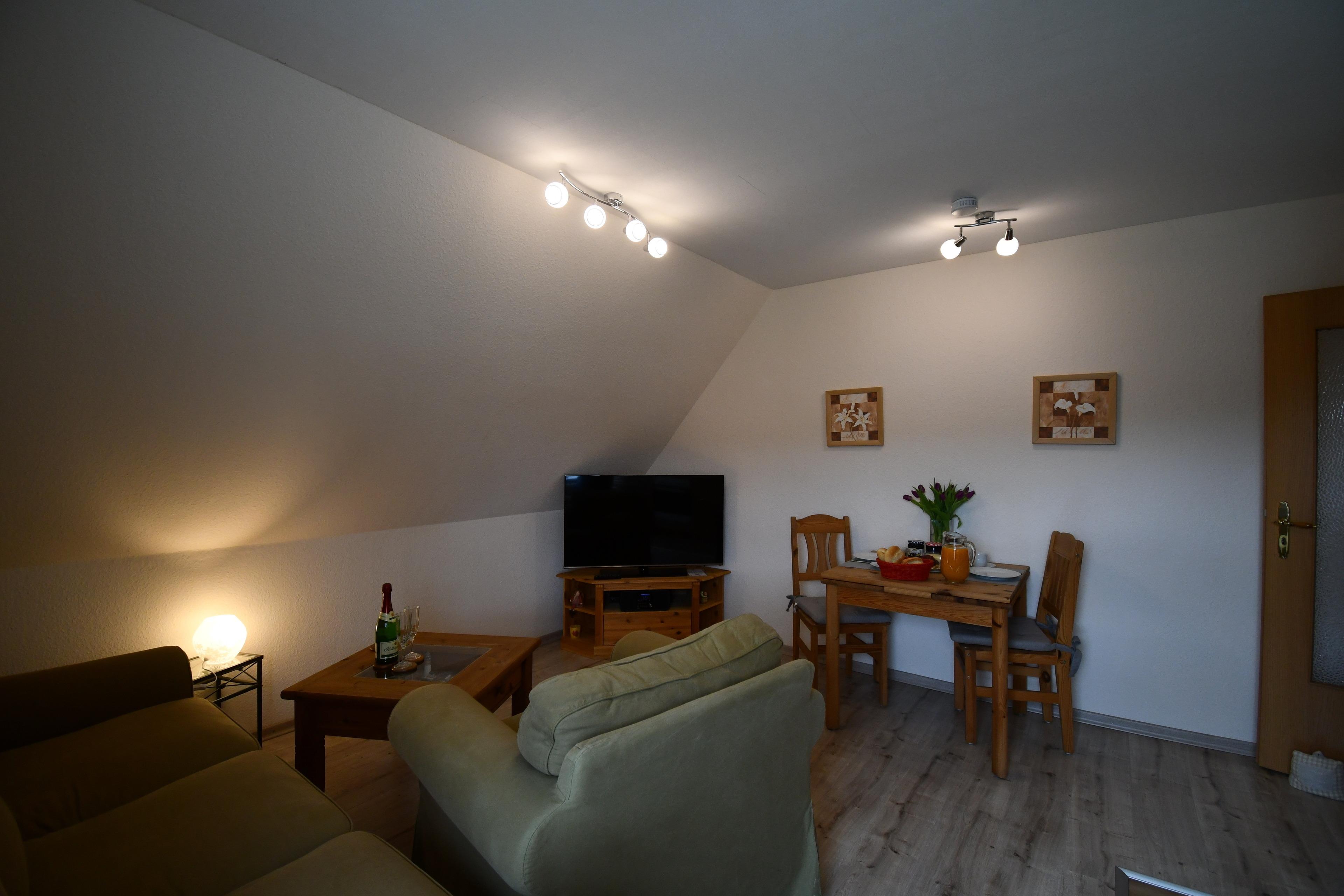 Alleinreisende oder Paare finden in dieser Unterkunft ausreichend Platz. Vom Flur mit Garderobe gelangen Sie einerseits in ein Wohnzimmer mit Sofa, Sessel und Esstisch, mit integrierter Küche, andererseits in das Schlafzimmer mit Doppelbett, geräumigen Kleiderschrank und angrenzendem Duschbad.