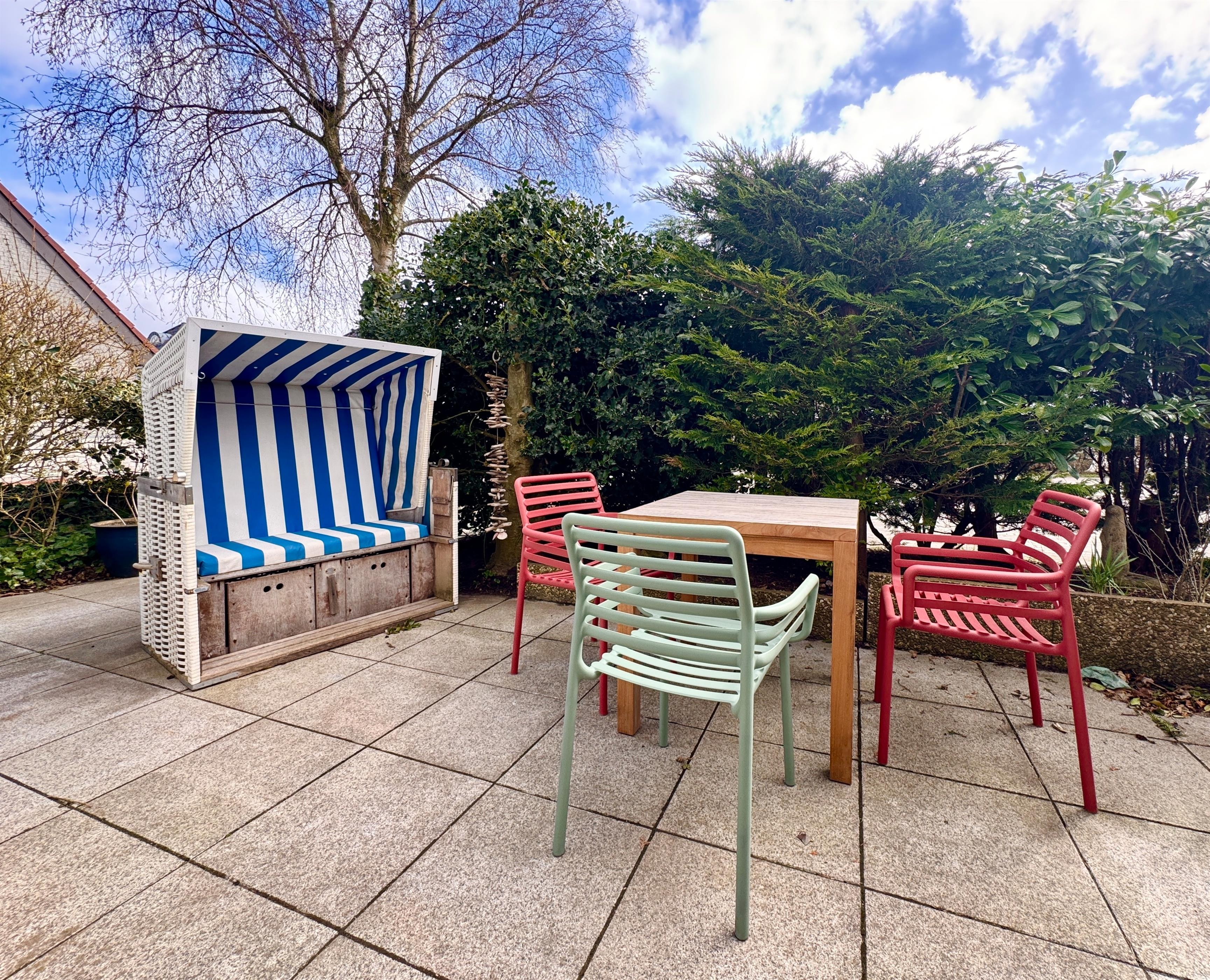 Die komplett neu, hell und geschmackvoll eingerichtete Wohnung "Käptn`s Koje" für 2 Personen empfängt Sie im maritimen Stil mit Blick auf die Terrasse und ins Grüne. Hier finden Sie Gartenmöbel zum Relaxen. Aber auch die Möglichkeit zum Sonnen-Frühstück, einem Kaffee zwischendurch oder mit einem Sundowner den Abend in Ruhe zu beenden, ist hier gegeben.