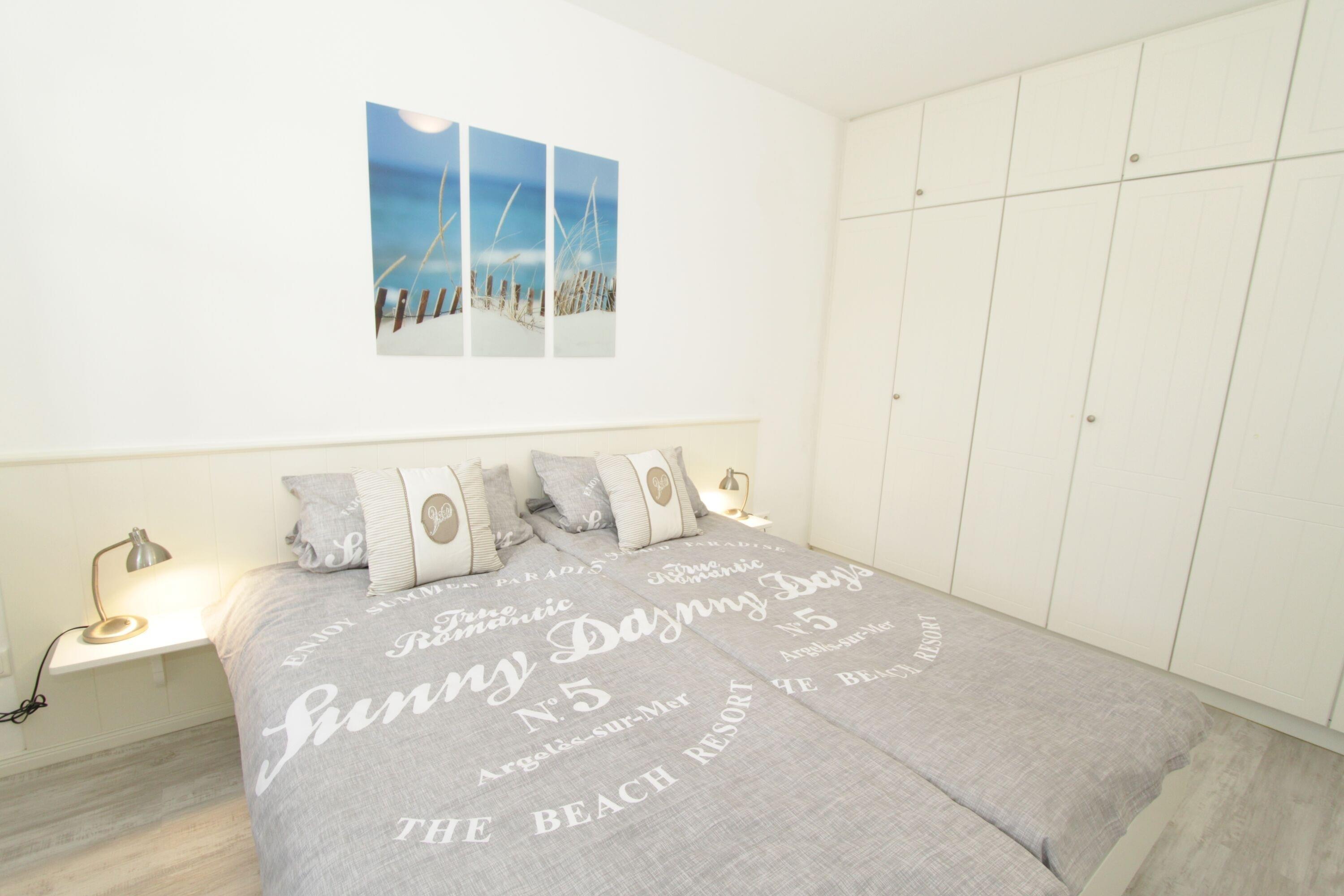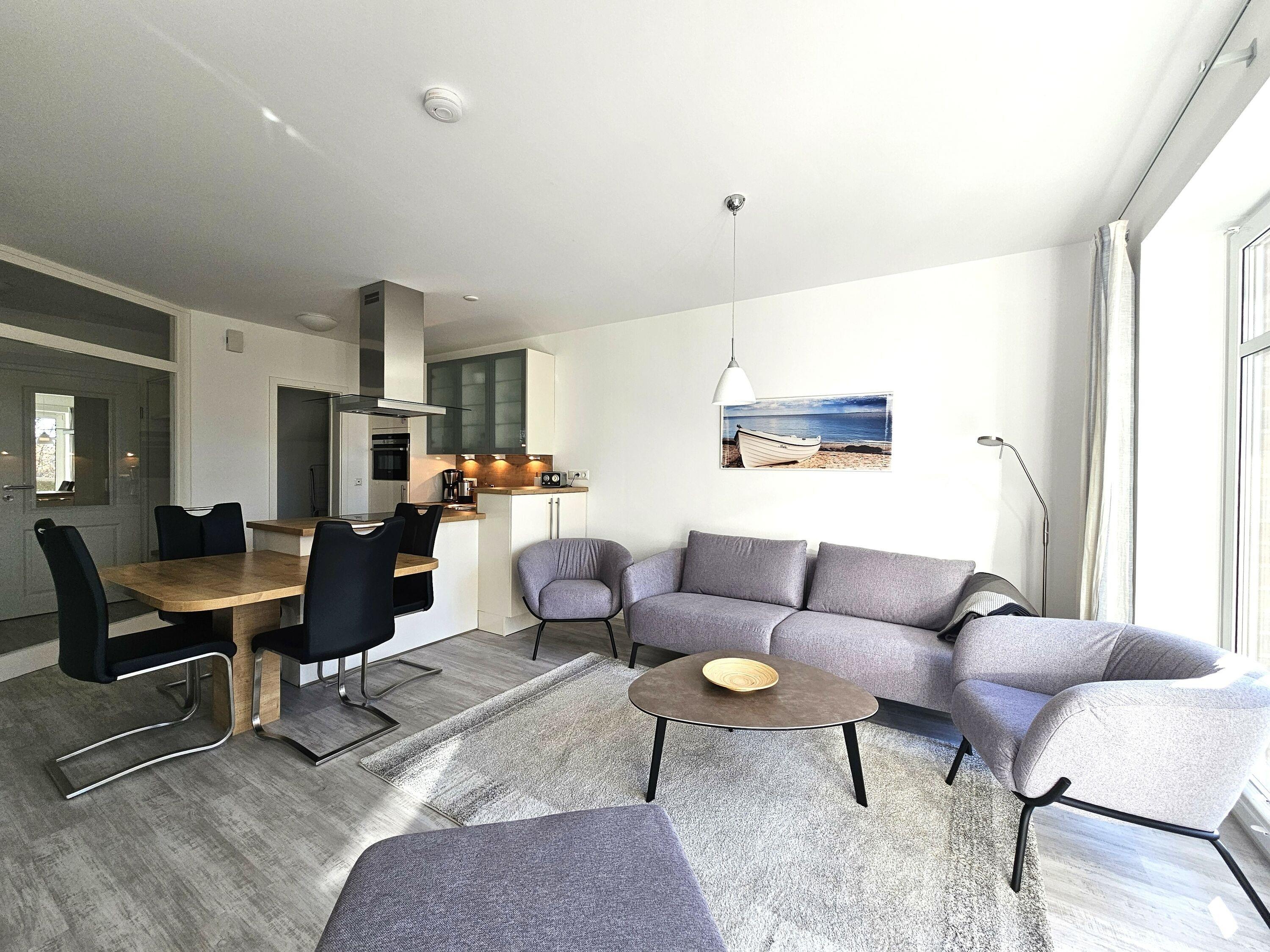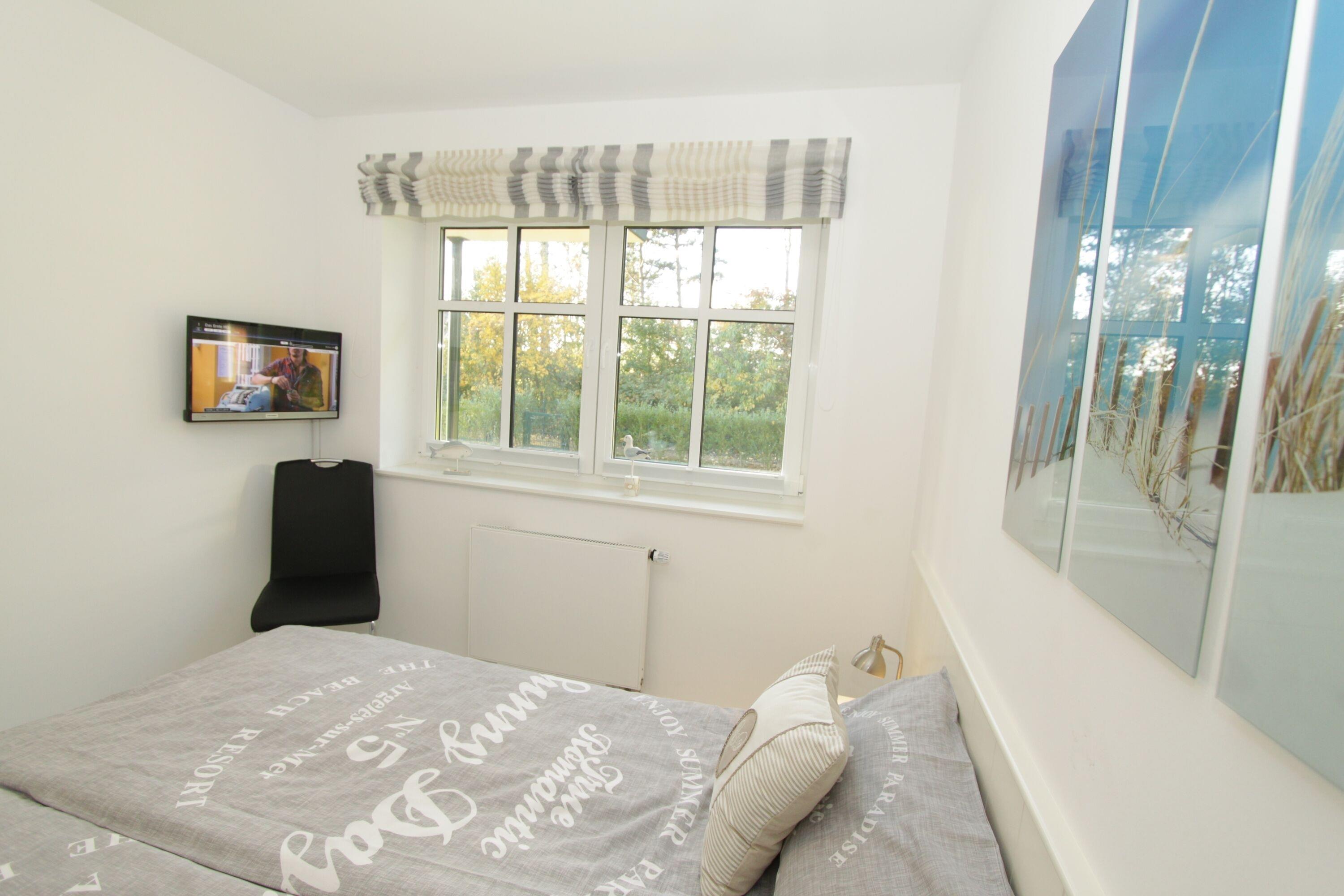 Die Wohnung befindet sich im Erdgeschoß und verfügt über eine Terrasse mit Blick ins Grüne - hier ist auch ein Strandkorb (während der Saison) vorhanden. Im Wohnbereich gibt es eine gemütliche Couch, eine voll ausgestattete Küche, ein Duschbad und zwei Schlafzimmer, jeweils mit TV.