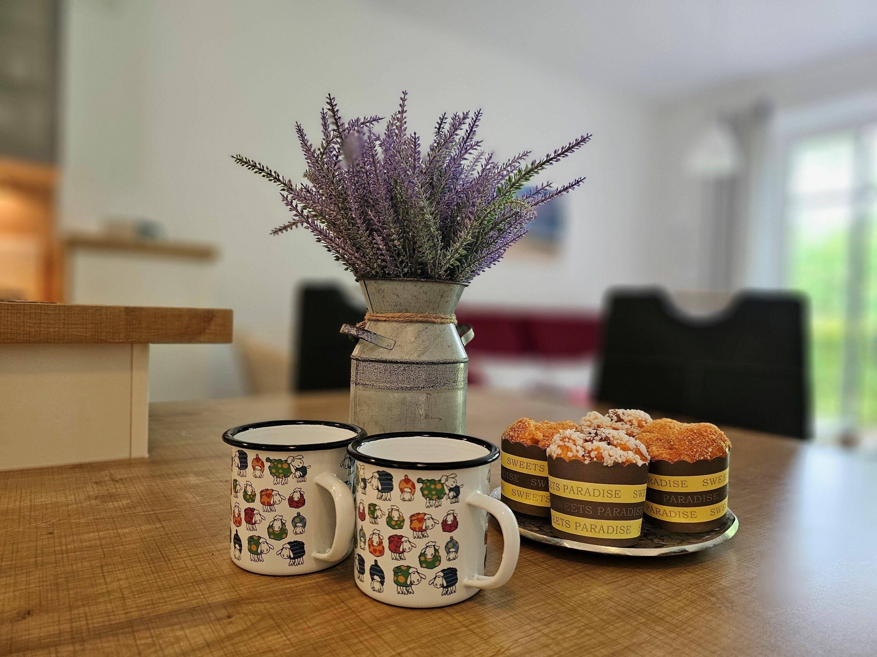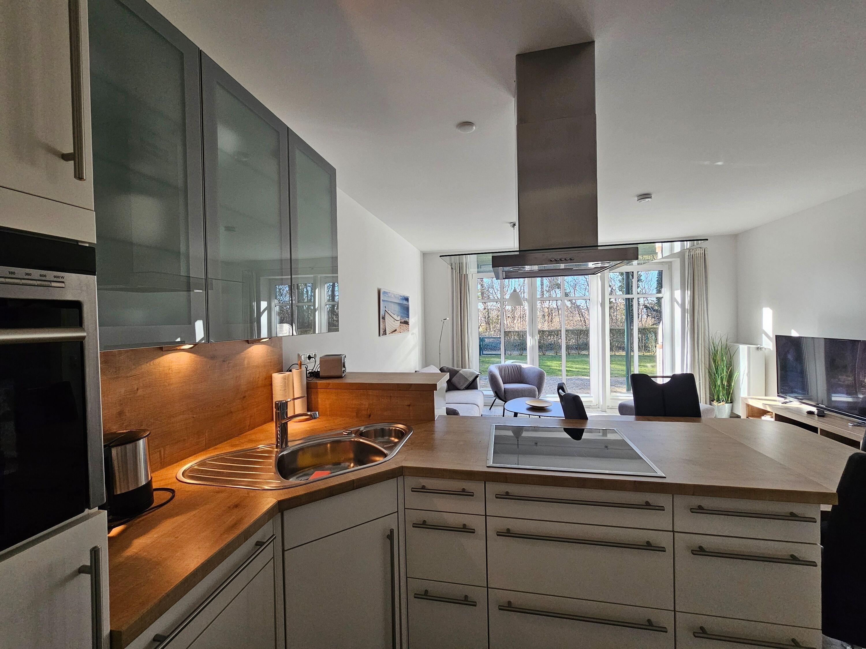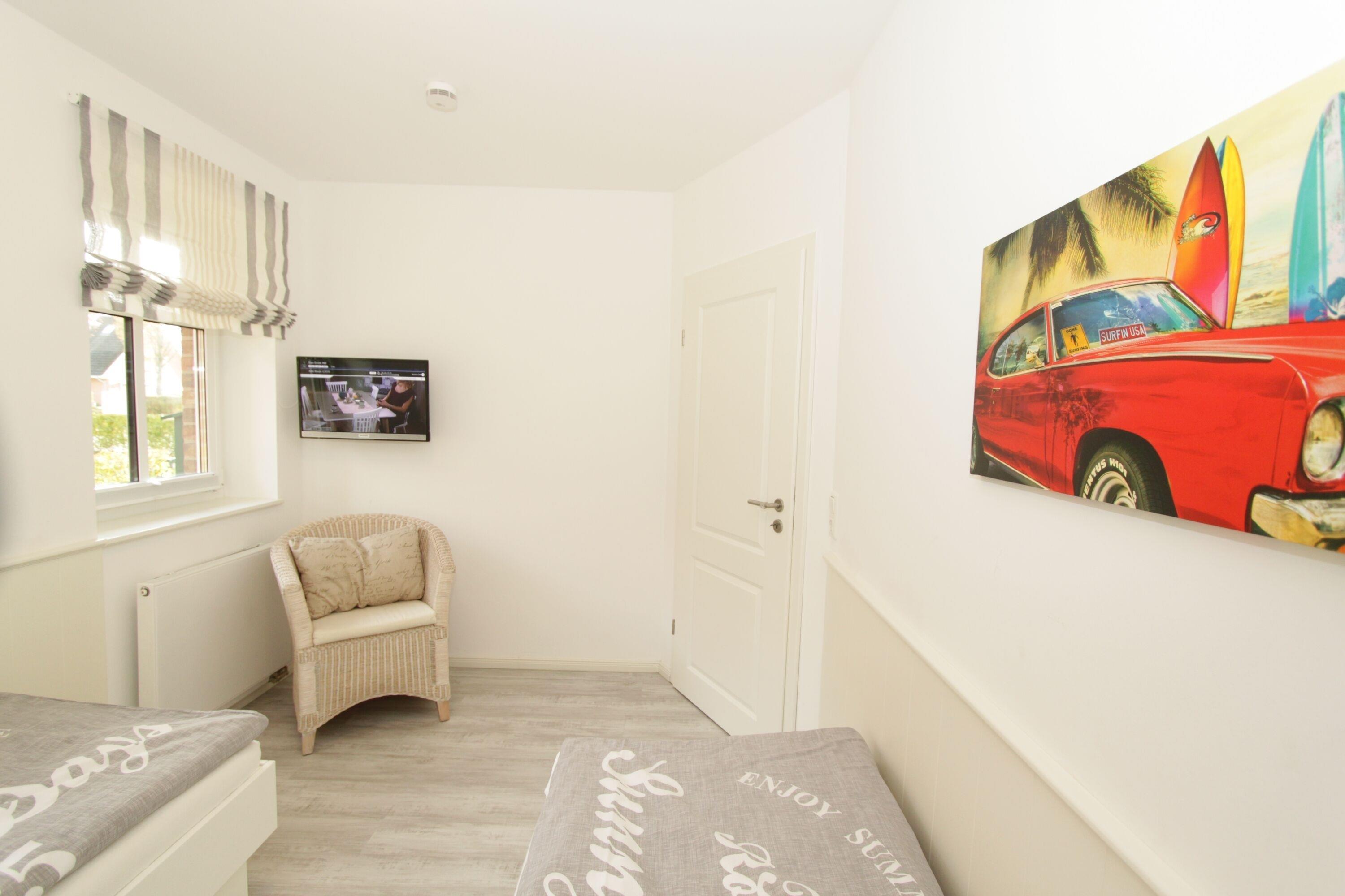 Die Wohnung befindet sich im Erdgeschoß und verfügt über eine Terrasse mit Blick ins Grüne - hier ist auch ein Strandkorb (während der Saison) vorhanden. Im Wohnbereich gibt es eine gemütliche Couch, eine voll ausgestattete Küche, ein Duschbad und zwei Schlafzimmer, jeweils mit TV.