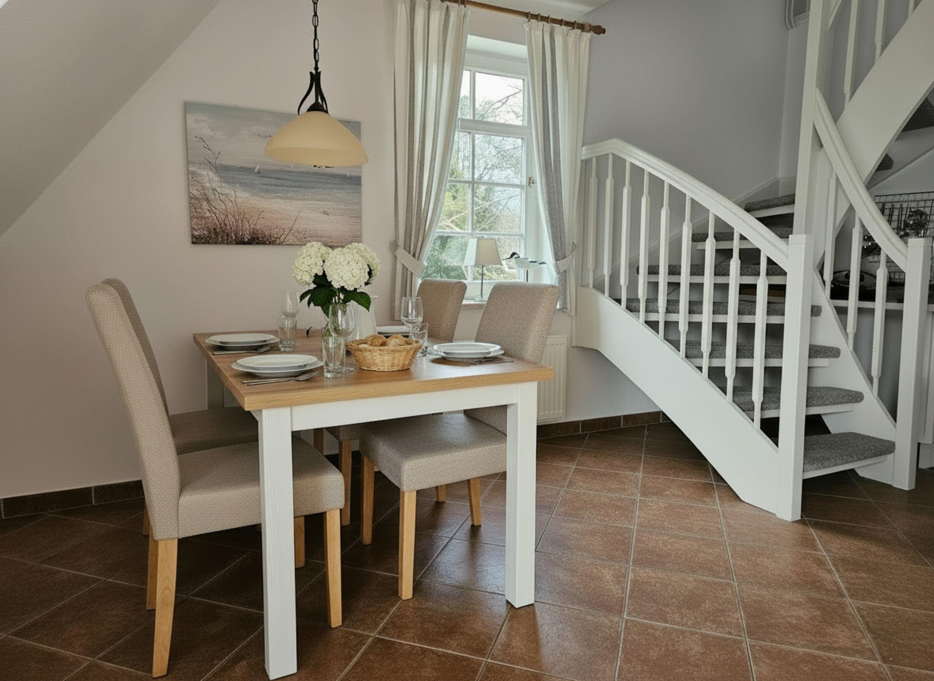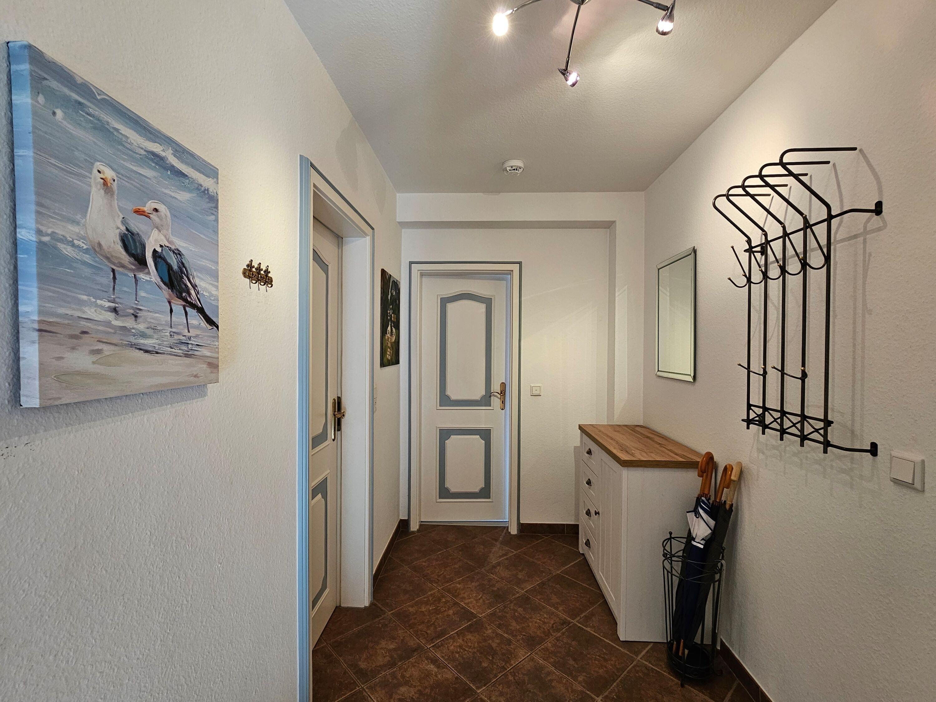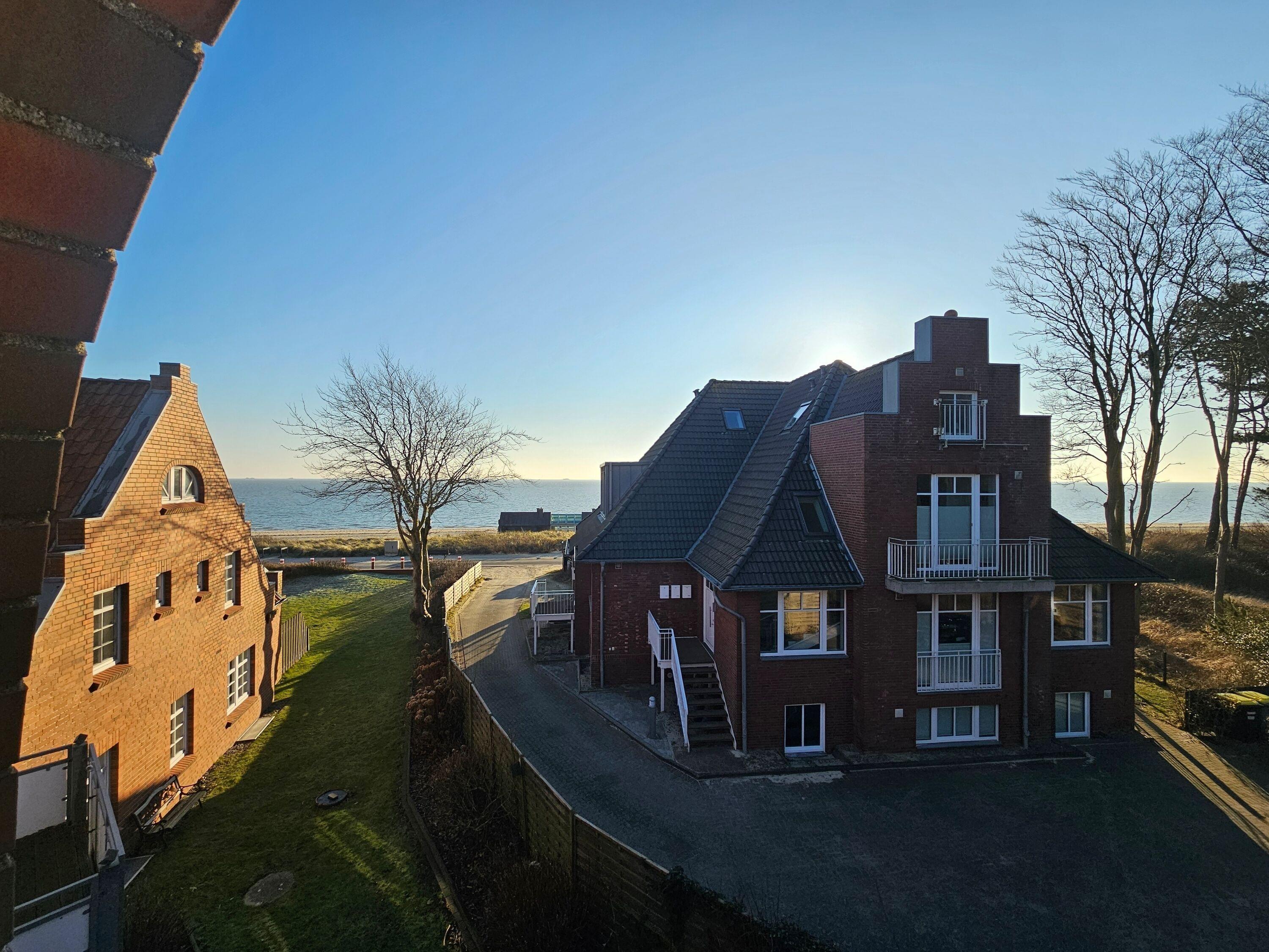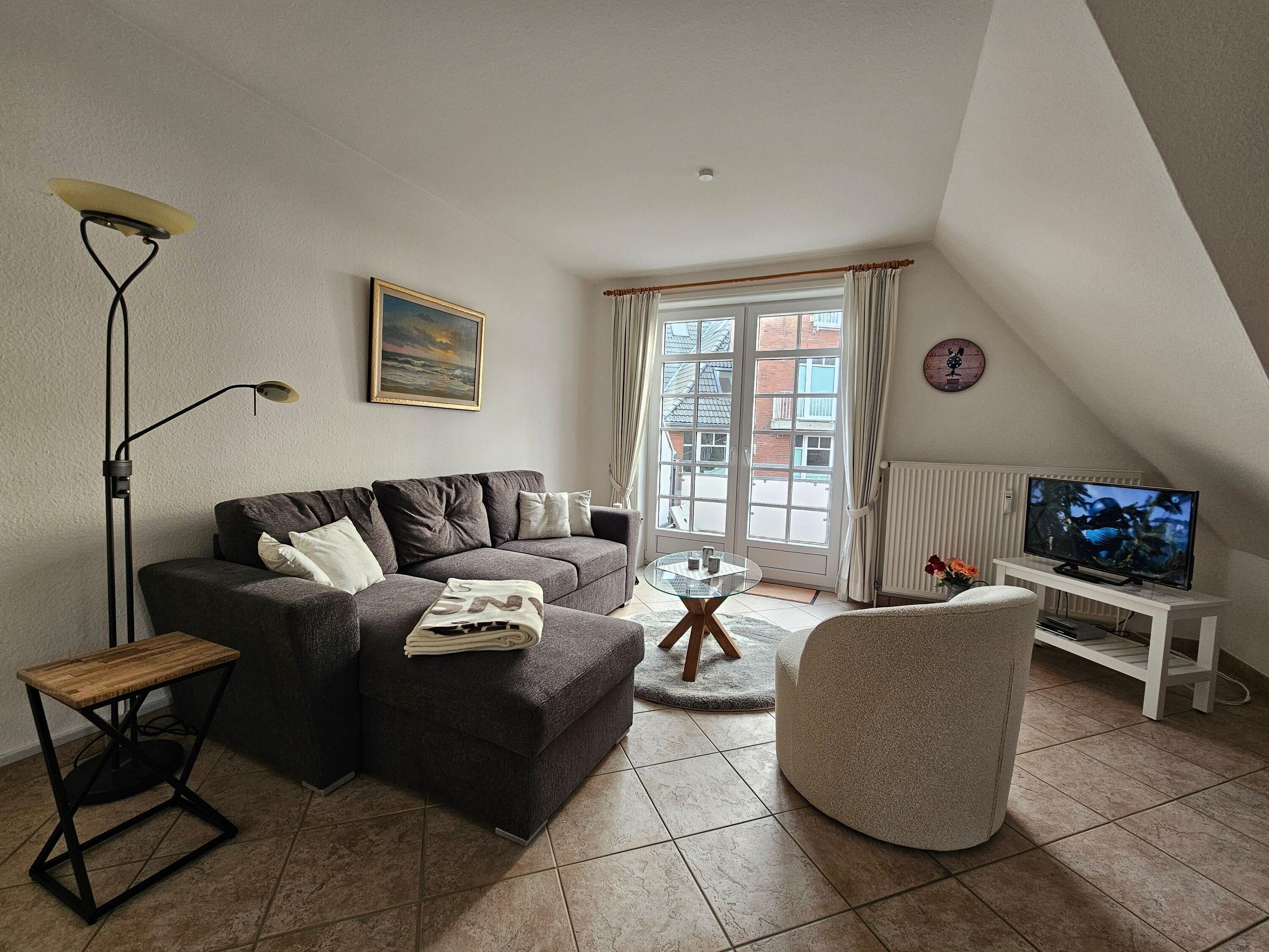 Die Wohnung befindet sich im Obergeschoss und verfügt über einen Südwest-Balkon mit seitlichem Teil-Meerblick durch Bäume. Im Wohnbereich gibt es eine voll ausgestattete Küche mit Esstisch, eine gemütliche Couch, ein Duschbad und ein Schlafzimmer. Im Dachgeschoss ist nach oben offen das zweite, geräumige Schlafzimmer.