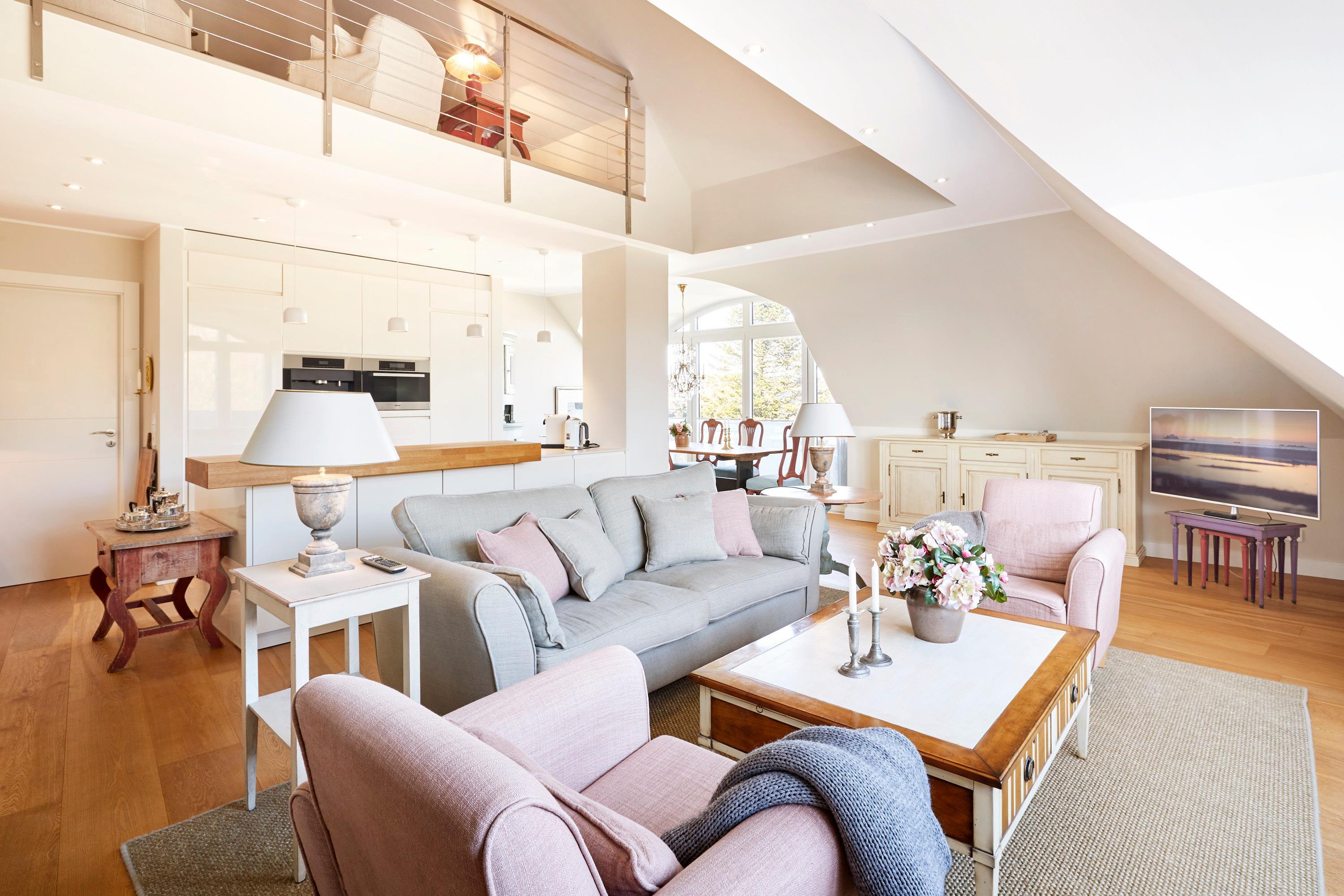 Auf einem wunderbar gelegenen 3.500 qm großen Grundstück befindet sich die exklusive Wohnanlage Quartier Rothtraut. Hier haben Sie die Nordsee direkt vor der Tür. Ein paar Schritte und Sie gelangen auf die Promenade, welche Sie ins Herz von Wyk führt. In Ihrer Penthouse-Wohnung über zwei Etagen genießen Sie in einem wunderschönen und modernen Ambiente Ihren Urlaub. Direkt vom großen Wohn-Essbereich schauen Sie auf die Nordsee und können den Gezeiten zusehen. Richten Sie den Blick in Ihrer Wohnung nach oben, haben Sie einen unendlichen Blick in die offene Galerie. Hier befindet sich eine gemütliche Kuschelecke und ein zweiter Wohnbereich. Genuss und Luxus pur in dieser Penthouse-Wohnung direkt am Meer.