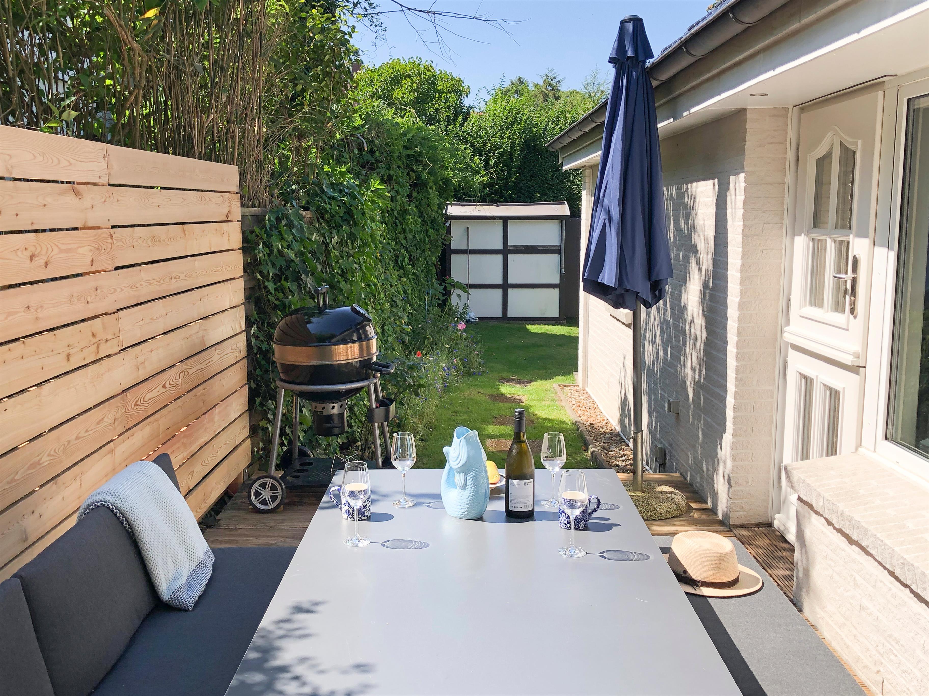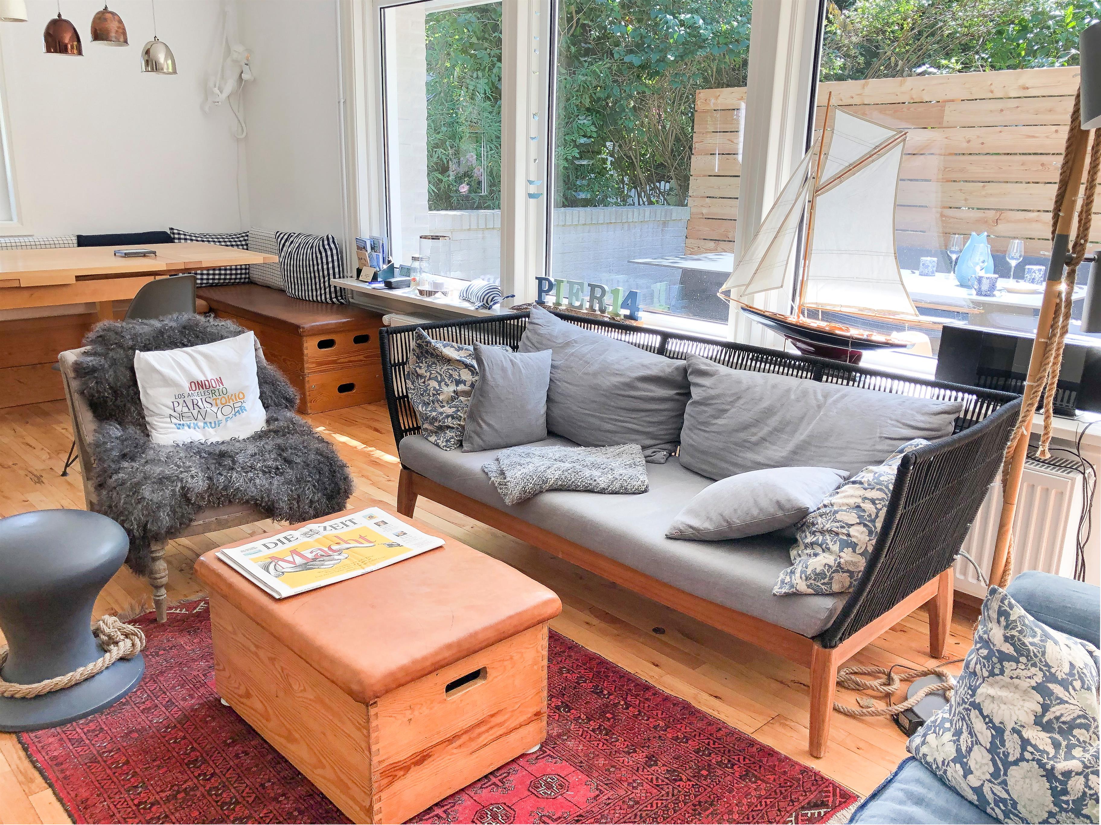 Trotz der zentralen Lage genießen Sie auf dem eingewachsenen Grundstück in einer ruhigen Einbahnstraße erholsame Momente und viel Privatsphäre. Das Haus wurde mit viel Liebe und einem Blick für besondere Details renoviert und überzeugt durch geschmackvolles Design und eine warme, einladende Atmosphäre. Der Kamin im Wohnzimmer mit großem Sichtfenster wird schnell zum Mittelpunkt Ihres Aufenthalts – hier können Sie bei einem prasselnden Feuer entspannen. Große Fensterfronten lassen viel Sonnenlicht in das Haus und sorgen für eine helle, freundliche Stimmung. Der Essbereich bietet genügend Platz für gesellige Runden mit Familie oder Freunden und führt Sie direkt auf die Holzbohlenterrasse mit Gartenmöbeln, wo Sie Ihre Mahlzeiten oder einfach die frische Luft genießen können.