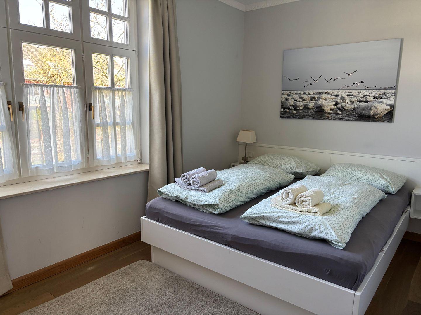 Das Schlafzimmer der Wohnung verfügt über ein bequemes Doppelbett (160cm breit), das Ihnen angenehme Nächte und erholsamen Schlaf garantiert. Genießen Sie ruhige Stunden und starten Sie ausgeruht in den neuen Tag, bereit für spannende Abenteuer auf der Nordseeinsel Föhr.