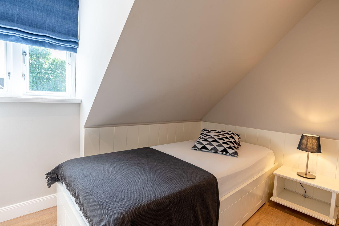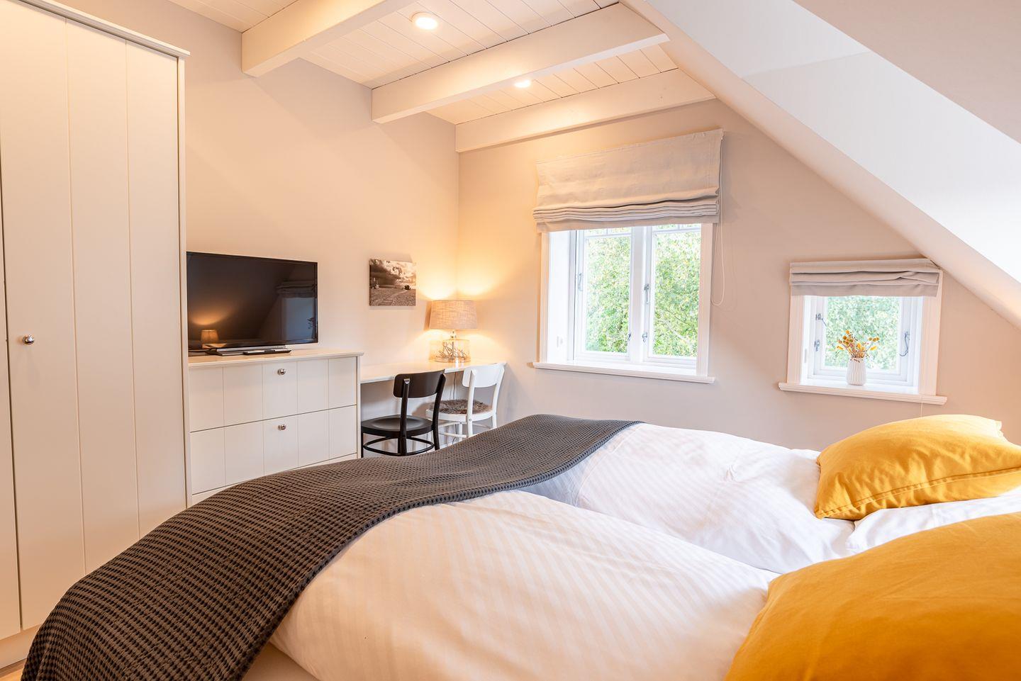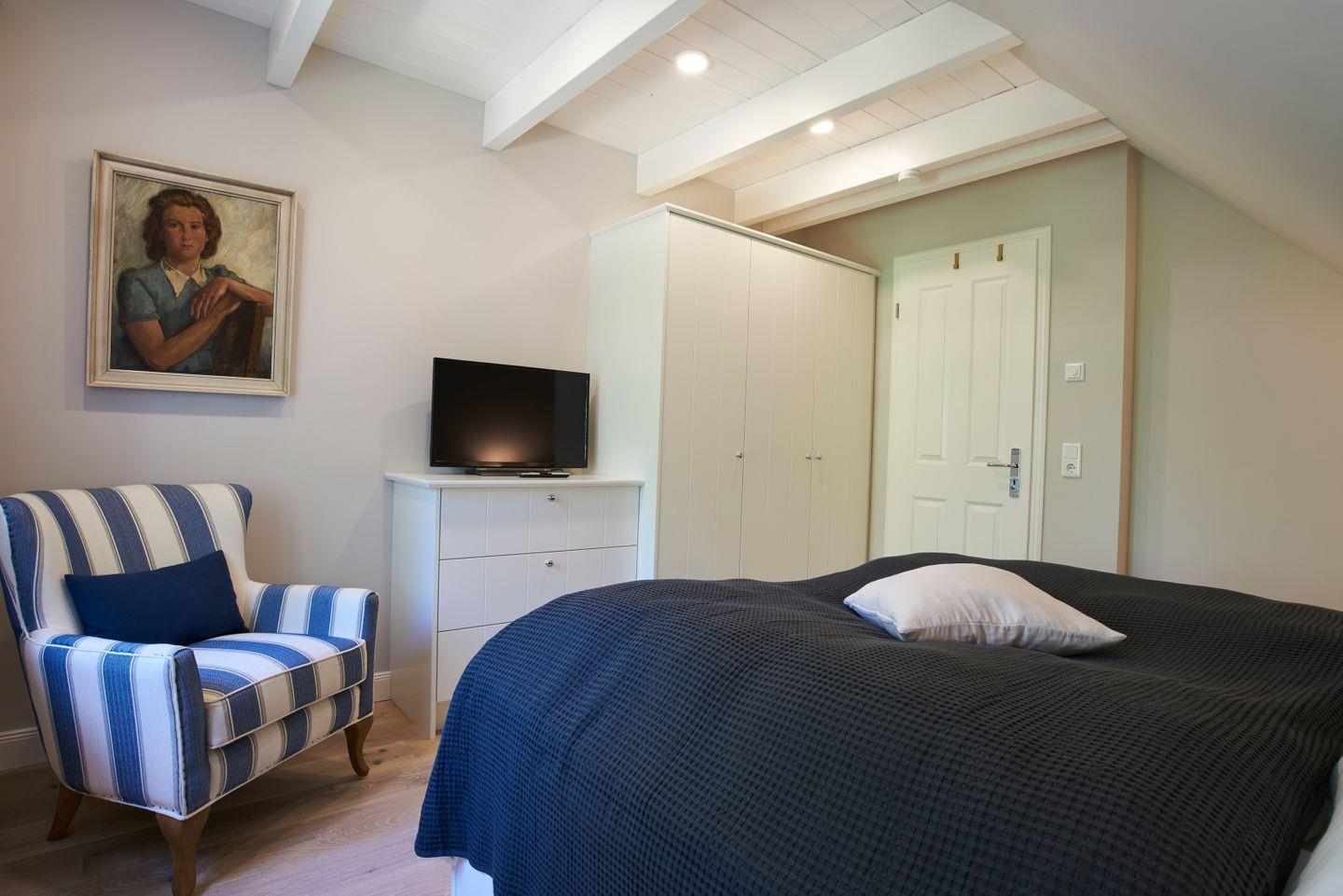 Im Obergeschoss befinden sich die zwei Schlafzimmer mit Doppelbett sowie ein weiteres Duschbad. In allen Schlafzimmern steht Ihnen ein Fernseher zur Verfügung. Die Doppelbettzimmer verfügen zudem über zusätzliche Sitzgelegenheiten. Das Obergeschoss verfügt außerdem über ein gemütliches Zimmer mit Dachgaube, das als zusätzliche Schlafgelegenheit mit einem Einzelbett ausgestattet wurde.