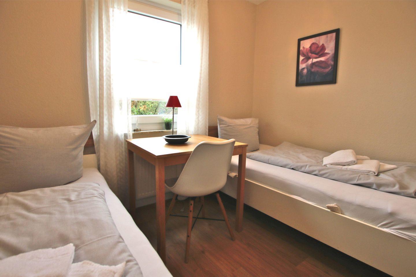 - Schlafzimmer mit zwei getrennt stehenden Betten und Kleiderschrank