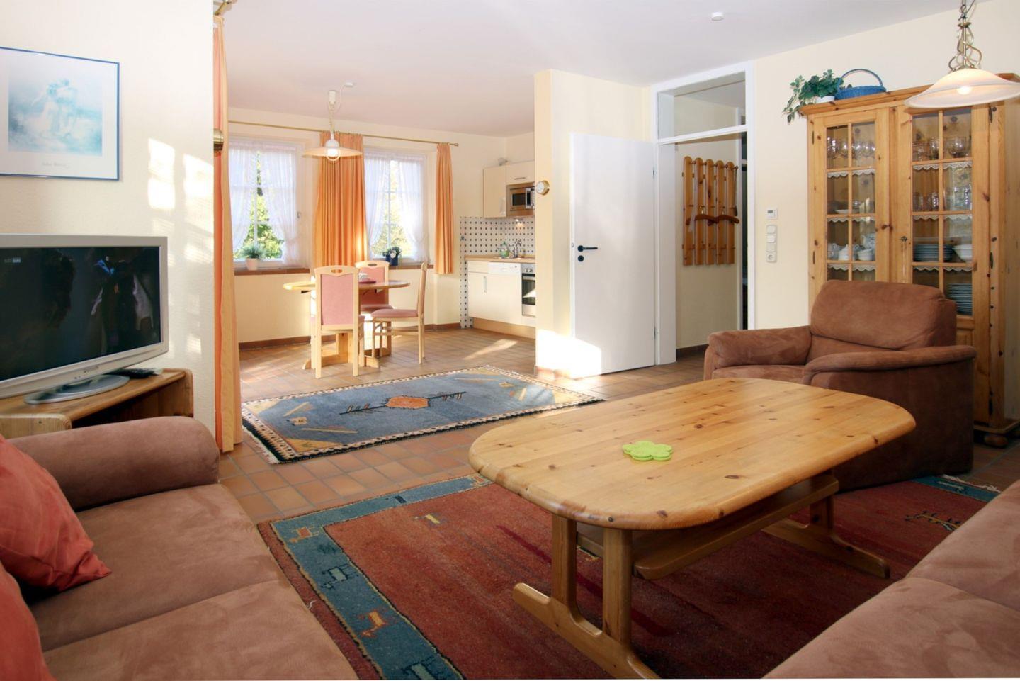 2-Zimmer-Nichtraucherwohnung im Erdgeschoß mit Südterrasse. WOHNZIMMER: Große Couch über Eck und 1 Sessel, Esstisch mit 4 Stühlen und KÜCHENZEILE mit Vollausstattung. SCHLAFZIMMER mit Doppelbett (1,60 x 2 m) und Kleiderschrank. BAD mit Dusche und WC. Fahrradständer und Parkplatz am Haus. Zum Strand sind es nur wenige Meter, zum Zentrum, Kurmittelhaus u. Wellenbad ca. 15 - 20 Minuten Fußweg. Die Wohnung ist liebevoll und gepflegt eingerichtet und verfügt über eine Fußbodenheizung (überall). Münzwaschmaschine und Trockner, Bügeleisen und -brett stehen im Keller zur Verfügung. Das Wohnzimmer ist mit Fliesen ausgelegt.