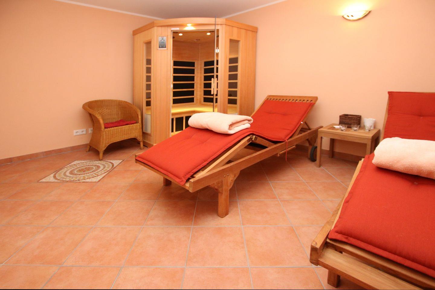 - Wellnessbereich mit Ruheliegen und Infrarotsauna Im Souterrain