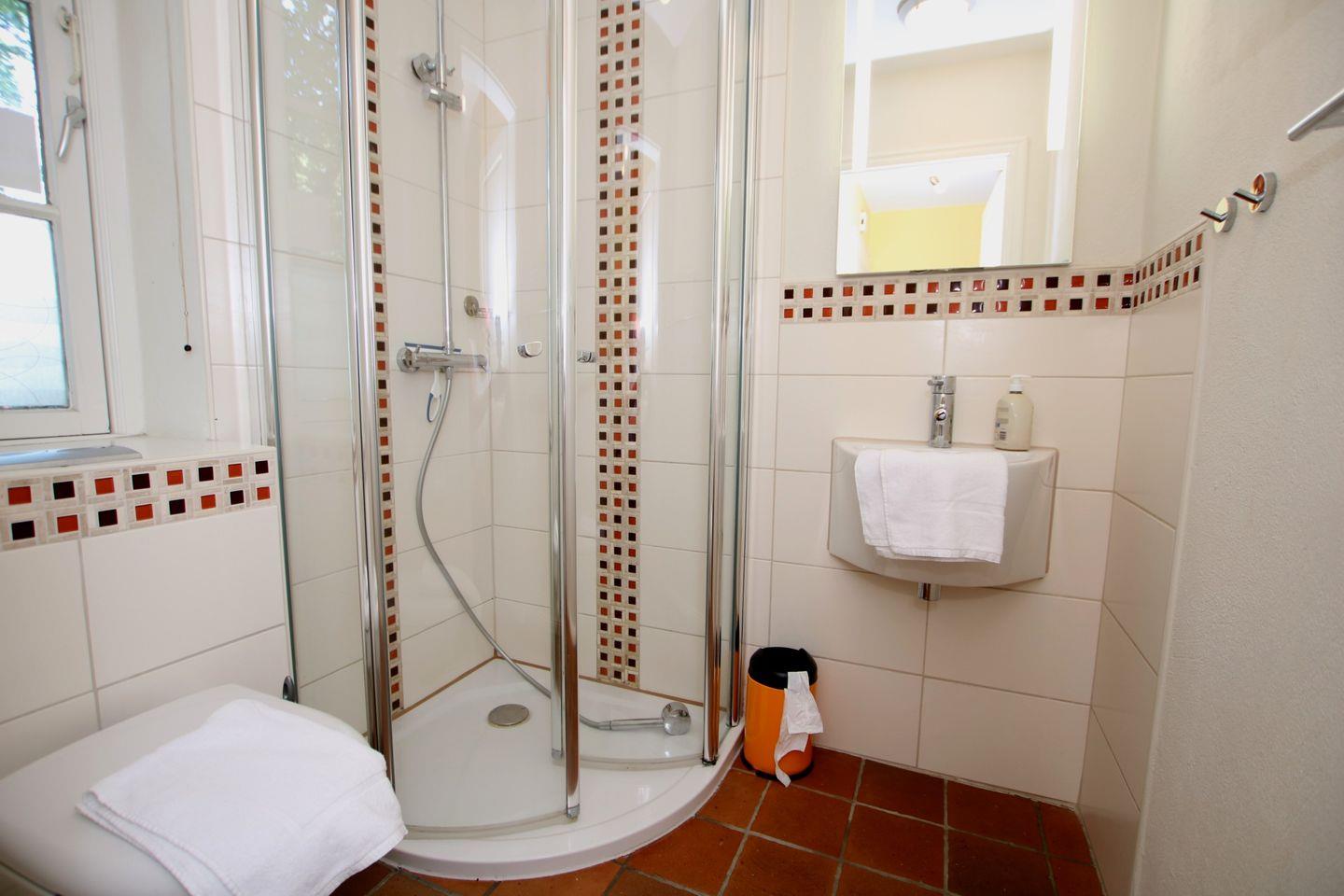 BAD 1 im EG: Dusche und WC. Vom Wohnzimmer führt eine Galerietreppe in die 1. Etage und in den Spitzboden. In der 1. Etage befindet sich ein SCHLAFZIMMER: mit Boxspring- Doppelbett (1,80 x 2m), Kleiderschrank, SAT/TV und ein zweites BAD nur mit Waschbecken und WC.