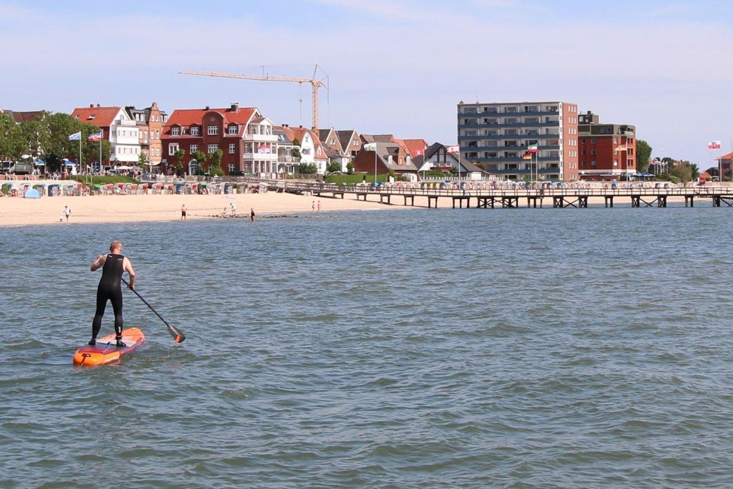 Ein Parkplatz steht nur zur Verfügung, wenn ein Platz frei ist, es gibt fürs Haus 6 Parkplätze. Die Wohnung liegt in direkter Strandlage und hat Blick aufs Wasser. Zum Wellenbad sind es ca. 10 bis 15 Minuten Fußweg.