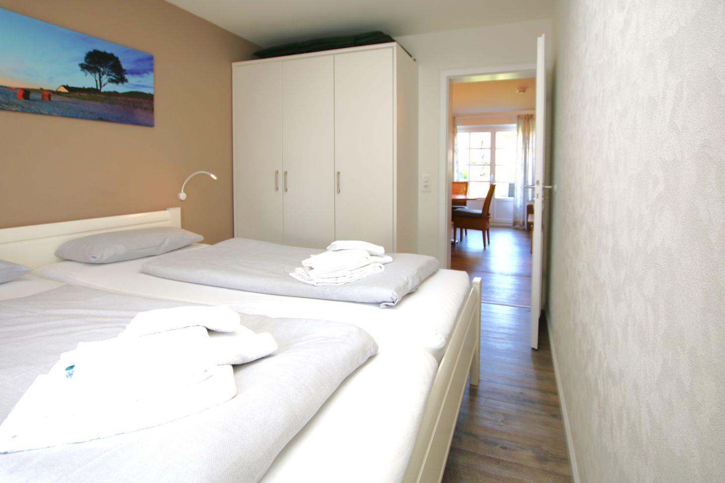sowie dimmbarem LED Leselicht am Bett. und ein Kleiderschrank. Kinderbett und Hochstuhl auf Wunsch inklusive. Die Schlafzimmer und das Wohnzimmer haben Designbelag. Im KELLER stehen Waschmaschine und Trockner auf Münzbasis zur Verfügung. Fahrradständer und Spielecke für Kinder am Haus. Haustiere auf Anfrage und gegen Gebühr. LAGE: Ruhig und dörflich in Marschnähe. Bushaltestelle ist im Dorf. Zum Zentrum von Wyk, Strand, Kurmittelhaus und Wellenbad sind es ca. 20 - 30 Minuten Fußweg.