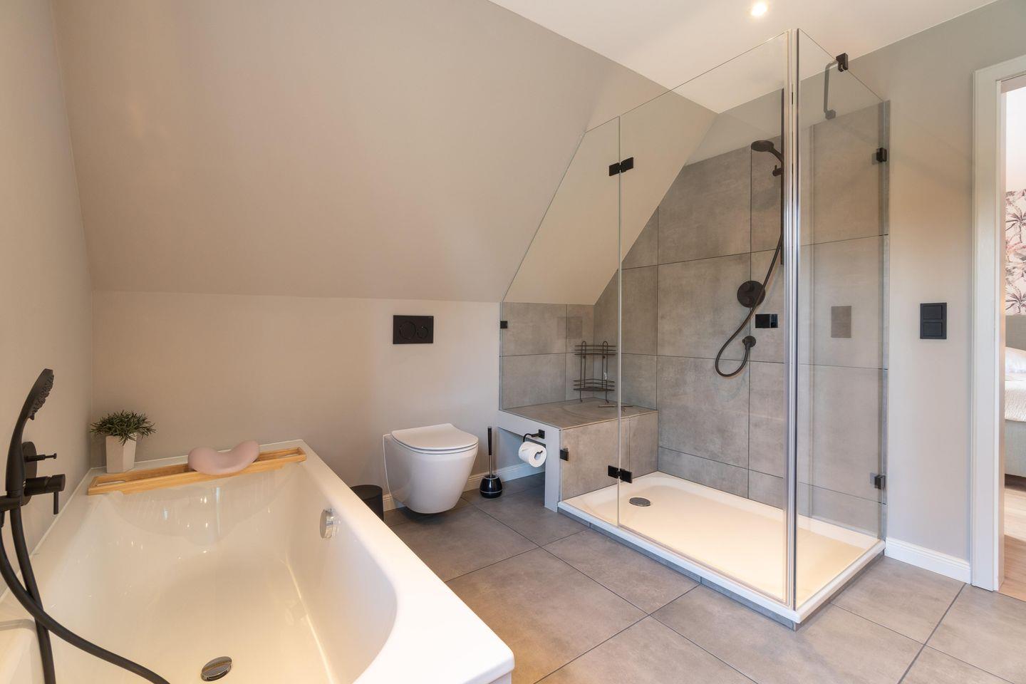 Im Obergeschoss sind zwei Schlafzimmer, ein Duschbad sowie ein Vollbad en Suite gelegen. In einem der Schlafzimmer befindet sich ein Arbeitsplatz mit Schreibtisch.