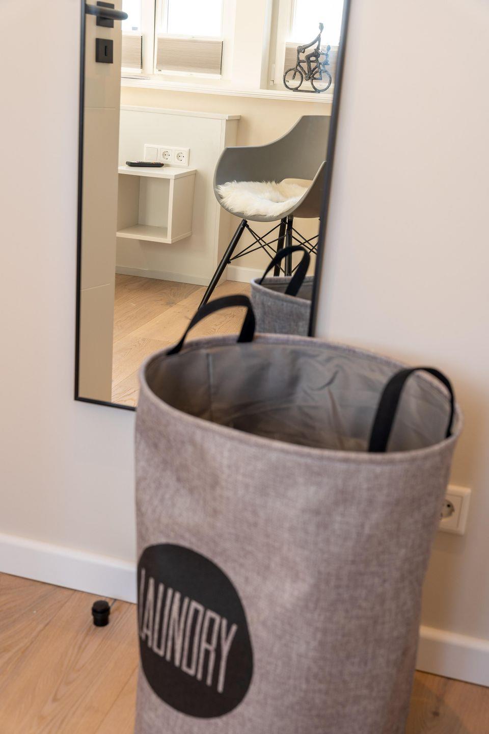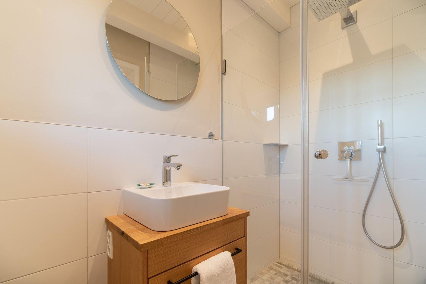 Im Obergeschoss sind die beiden Schlafzimmer sowie das zweite Duschbad gelegen. Das erste Schlafzimmer verfügt über ein Doppelbett, das zweite über zwei Einzelbetten, die auch zu einem Doppelbett zusammengeschoben werden können. Die Betten und Einbauschränke wurden von einer hiesigen Tischlerei angefertigt. Im Duschbad befinden sich eine Waschmaschine und ein Trockner sowie ein weiteres Sonos-Radio.