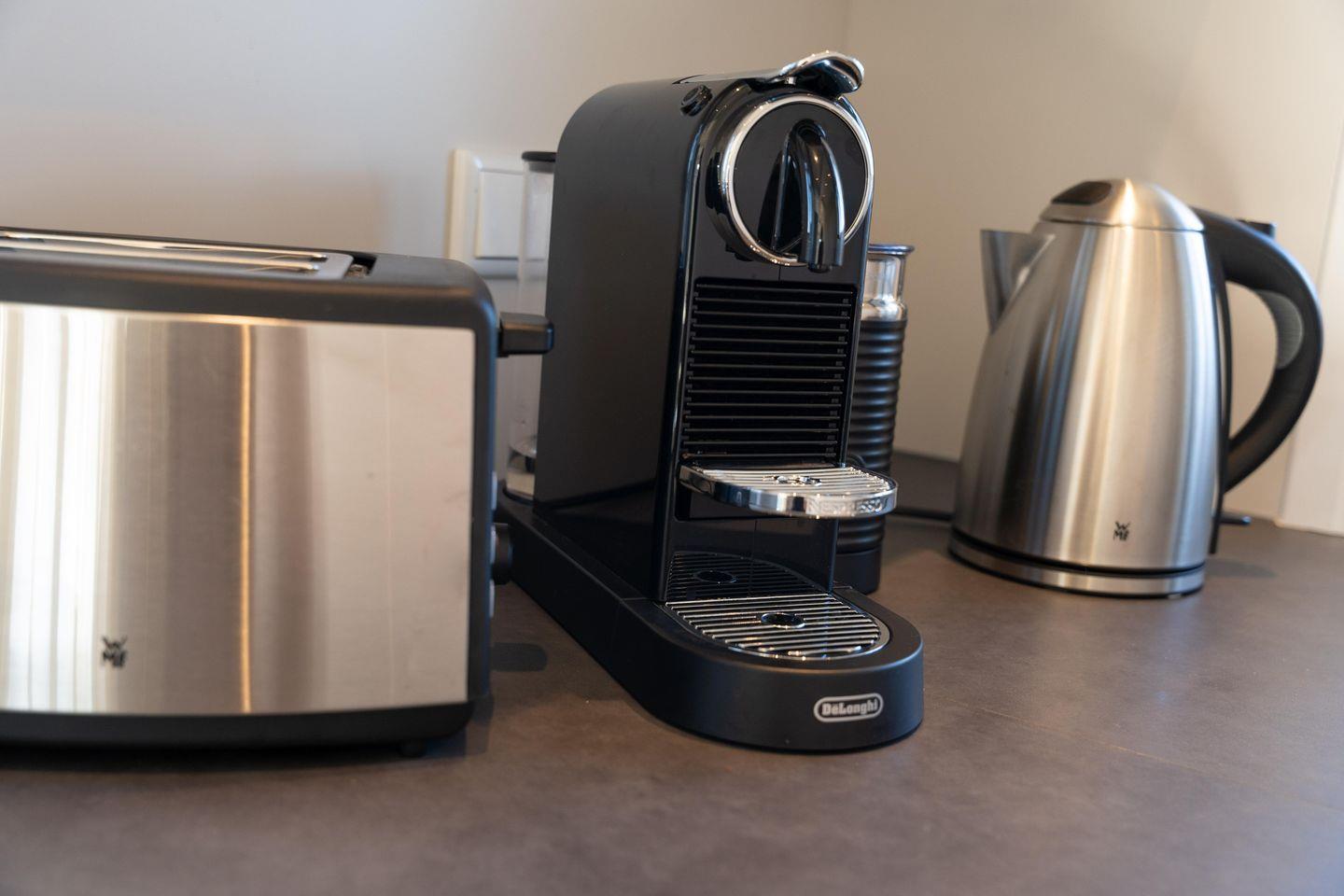 Im Erdgeschoss befinden sich der großzügige Wohn- und Essbereich mit offener Küche sowie eines der zwei Duschbäder. Über den Wohnbereich gelangen Sie direkt auf die eigene Terrasse und in den Garten. Der Kamin und das WLAN-fähige Radio der Marke Sonos sorgen auch an kühleren Tagen für eine wohlige Atmosphäre. Die Küche ist mit hochwertigen Markengeräten ausgestattet, wie z. B. einem Nespresso-Kapselmaschine mit Milchaufschäumer und Frenchpress.