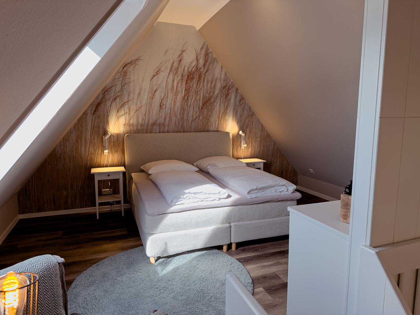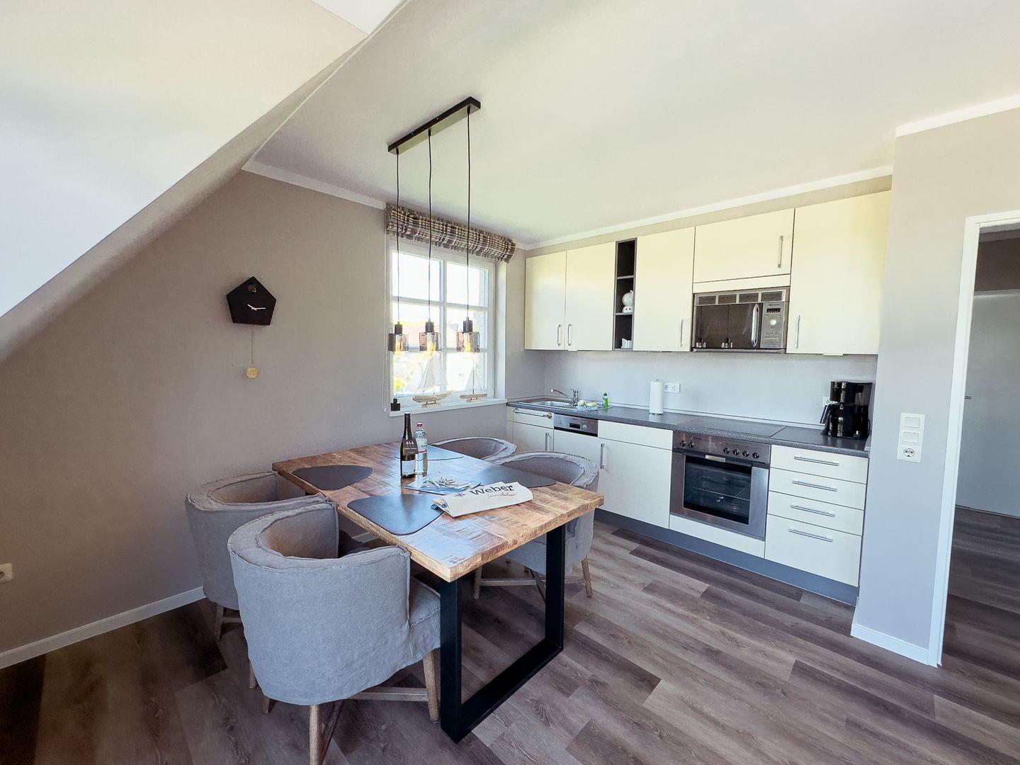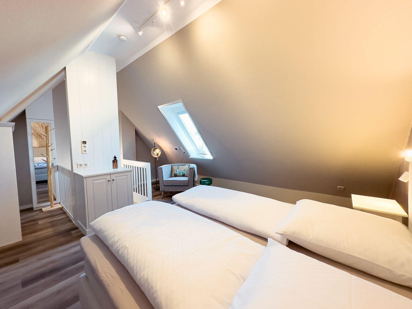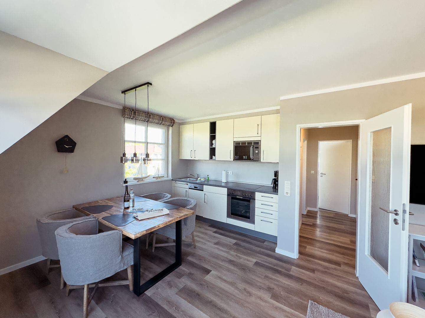 Die Obergeschosswohnung verfügt über einen Wohn- und Essbereich mit offener Küche, zwei Schlafzimmer - eines mit einem Doppelbett, eines mit einem Einzelbett und einem Ausziehbett - und ein Duschbad. Über den Wohnbereich gelangen Sie direkt auf den eigenen Balkon. Die Nutzung des Gartens ist den Gästen der Erdgeschosswohnungen vorbehalten.