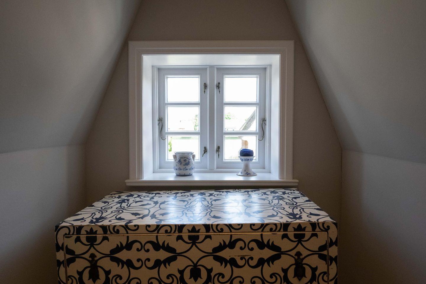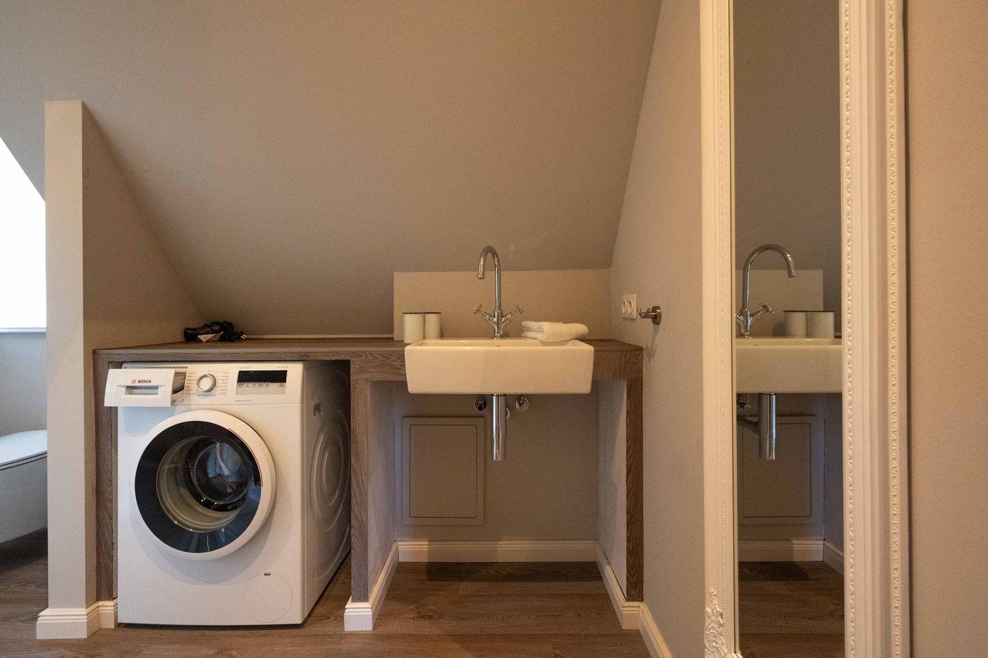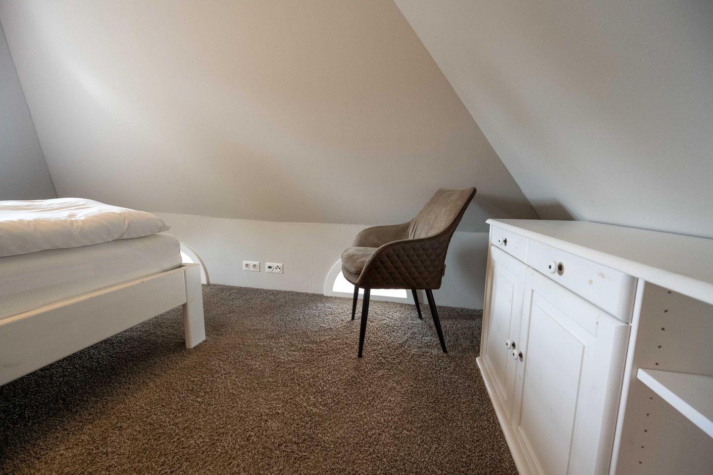 Im Obergeschoss sind die beiden Schlafzimmer sowie das Duschbad mit Waschmaschine gelegen. Das erste Schlafzimmer ist mit einem Doppelbett ausgestattet. Das zweite Schlafzimmer verfügt über zwei sehr komfortable Bodenmatratzen, die bei einer Buchung mit vier Personen nebeneinander und bei einer Buchung mit drei Personen übereinander gelegt werden.
