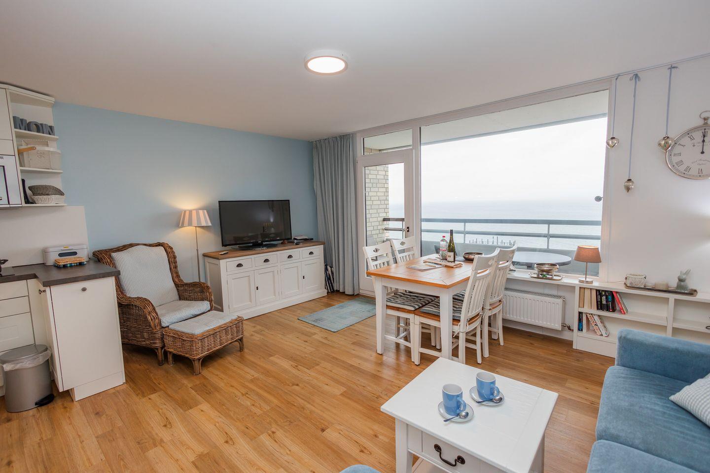 Die 2-Zimmer-Wohnung befindet sich im fünften Obergeschoss und unterteilt sich in einen gemütlichen Wohn- und Essbereich mit offener Küche und Schlafsofa, ein Duschbad sowie ein Schlafzimmer mit zwei Einzelbetten. Über den Wohnbereich gelangen Sie auf den eigenen überdachten Balkon.