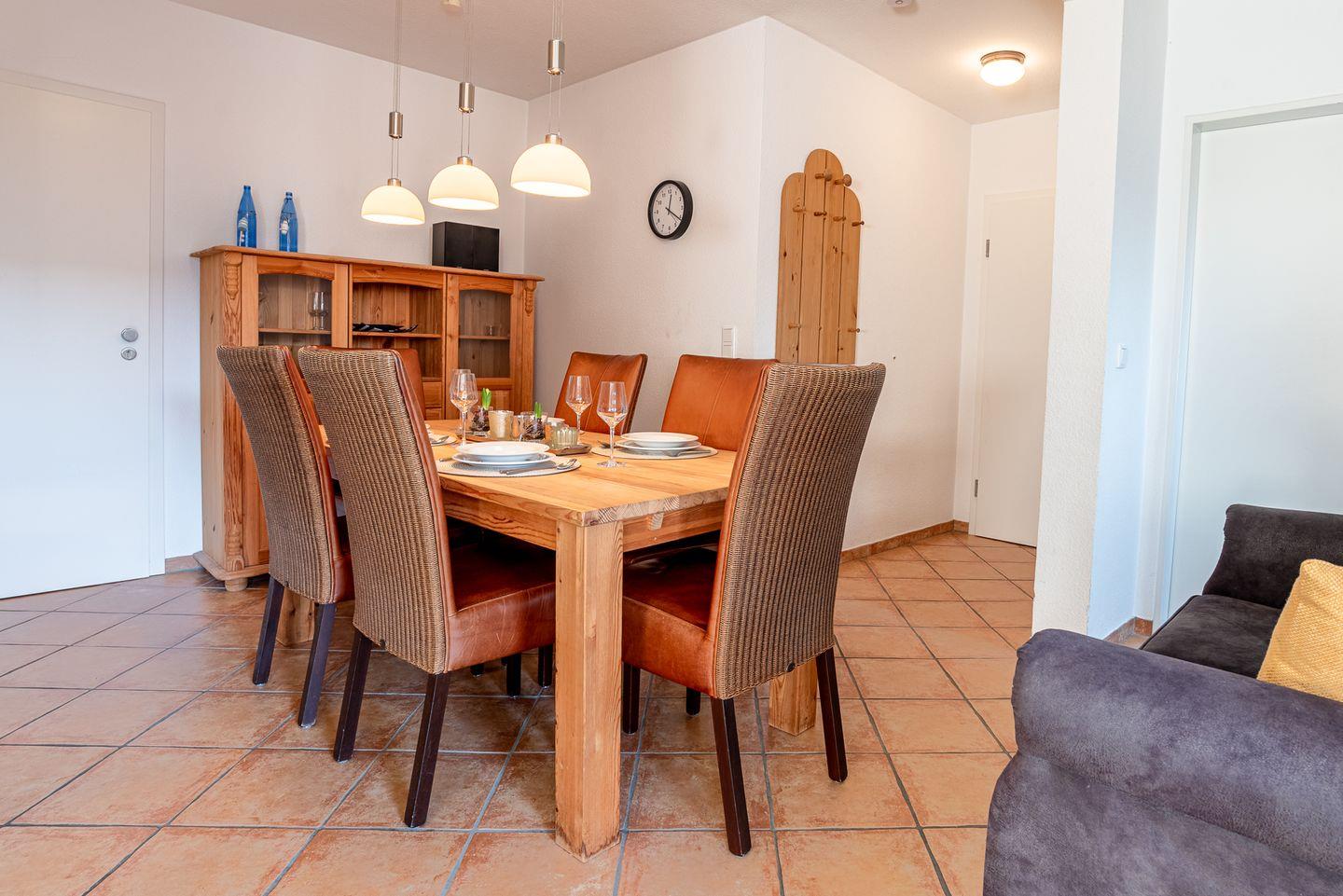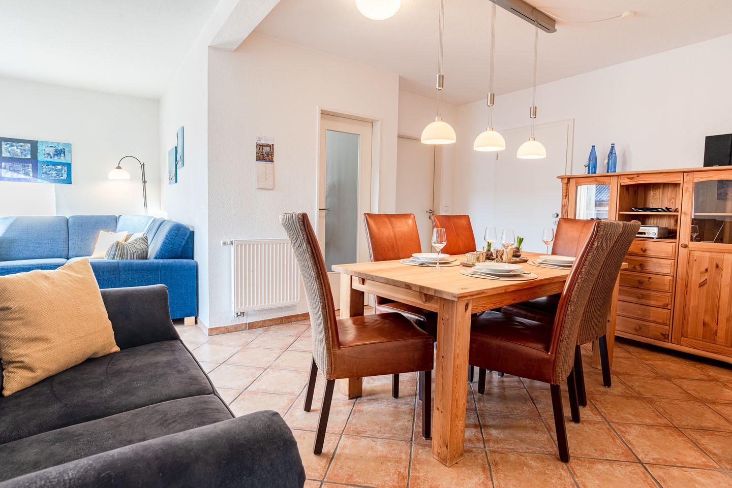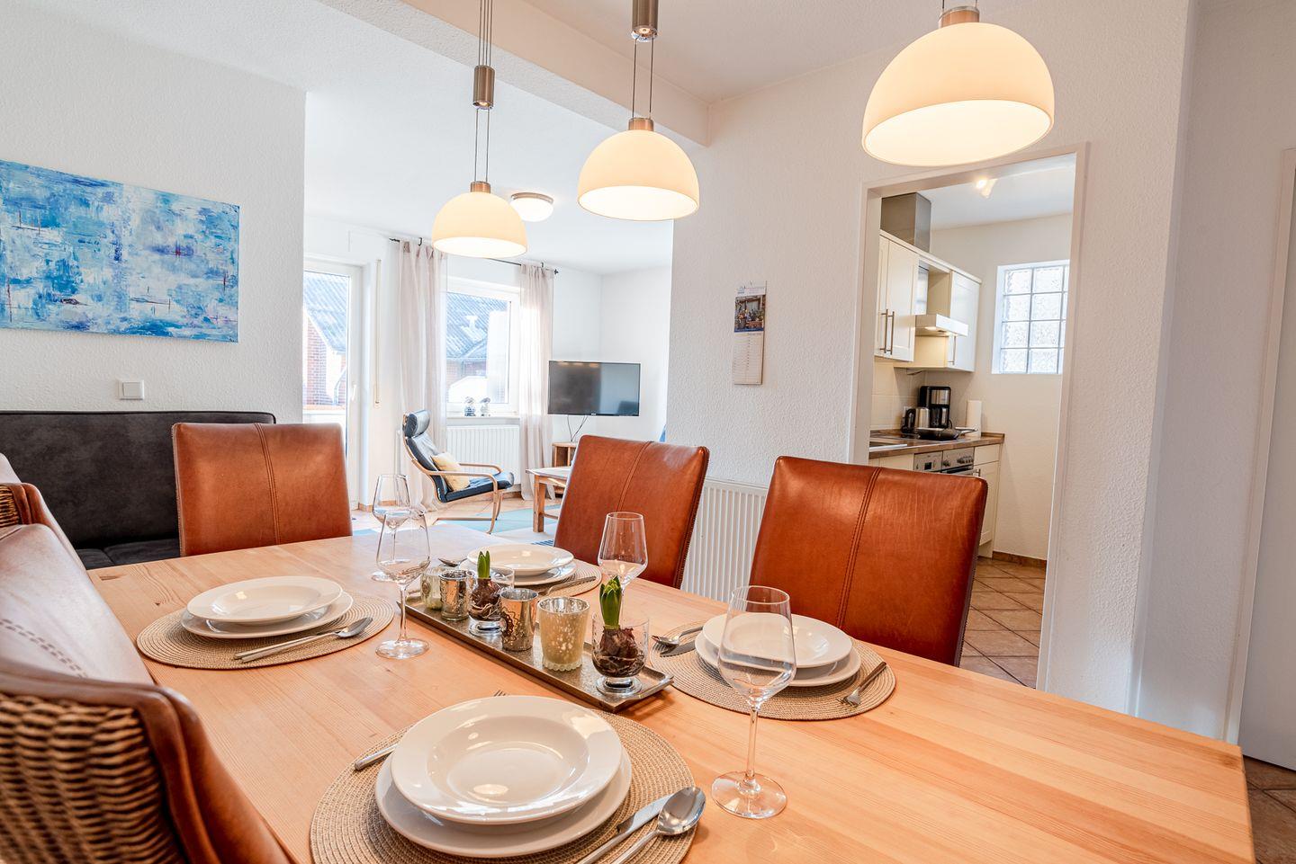 Die Ferienwohnung besticht durch ihre moderne Einrichtung und eine helle, freundliche Atmosphäre. Der offene Wohnbereich ist der perfekte Ort zum Entspannen und Verweilen. Hier finden Sie eine gemütliche Sitzecke, die zum Lesen oder gemeinsamen Spielen einlädt, sowie einen Essbereich, an dem Sie gesellige Mahlzeiten genießen können. Die voll ausgestattete Küche bietet alles, was Sie für die Zubereitung Ihrer Lieblingsgerichte benötigen.
