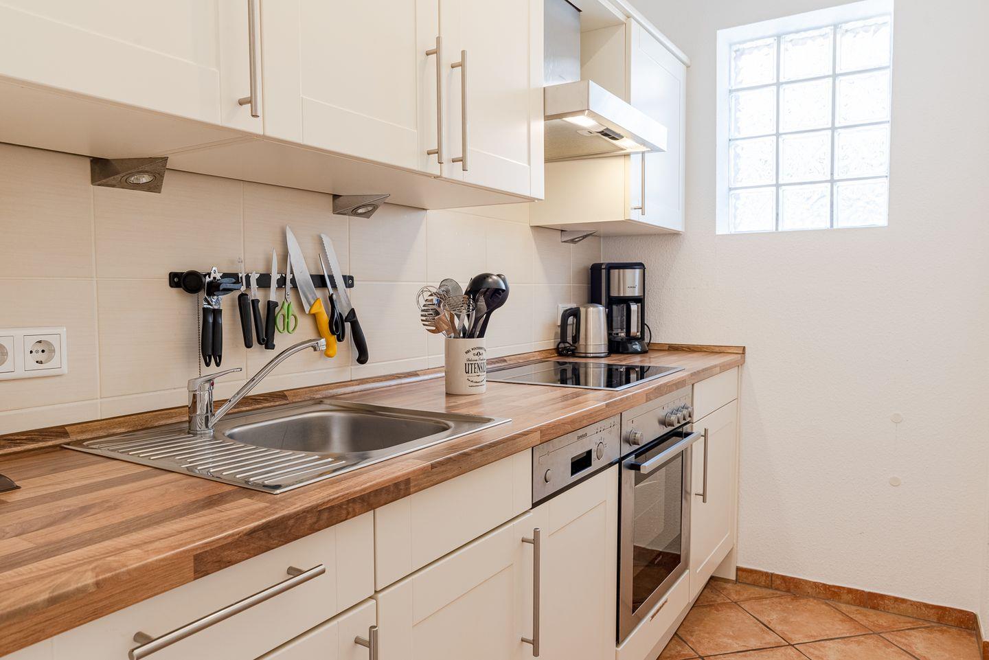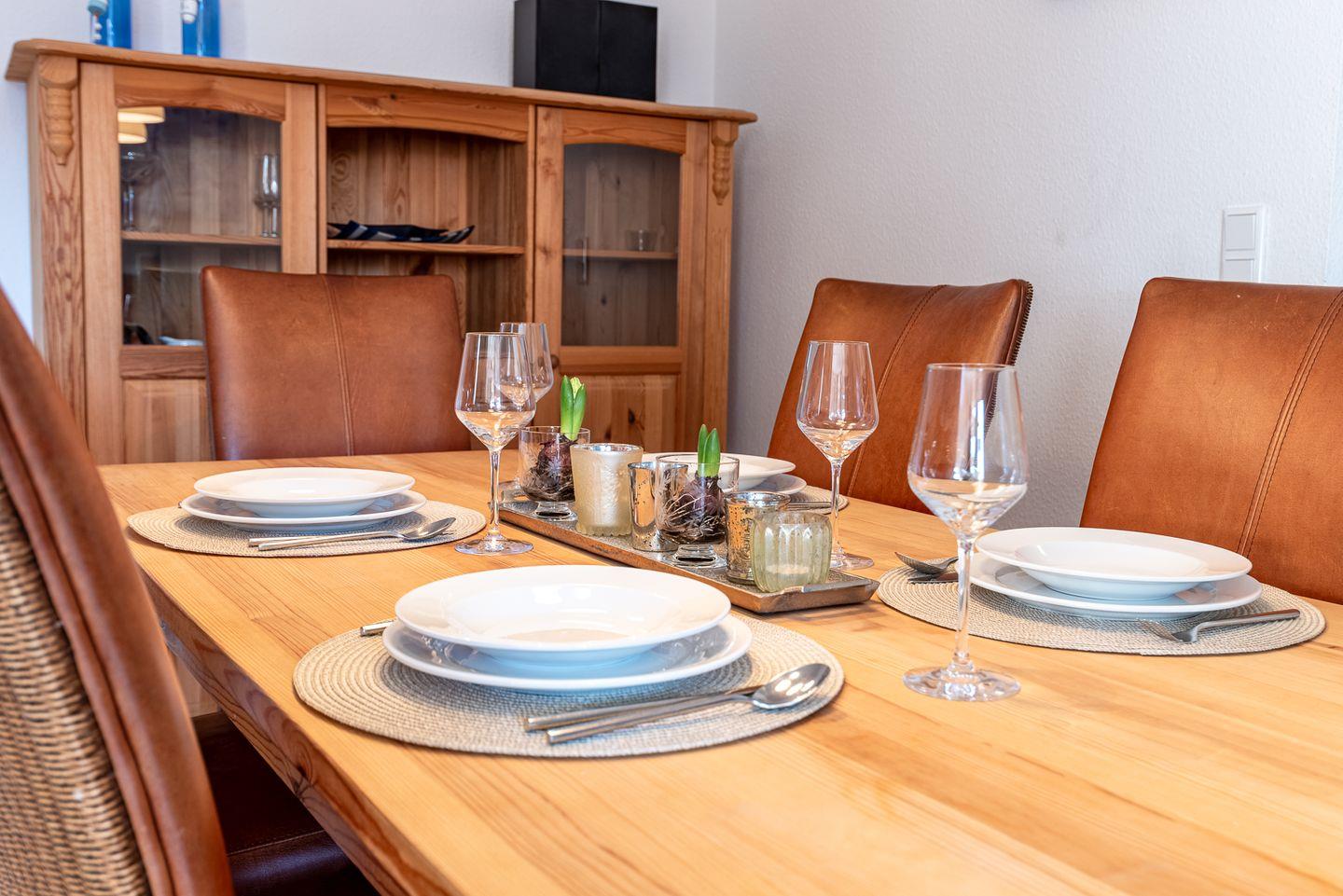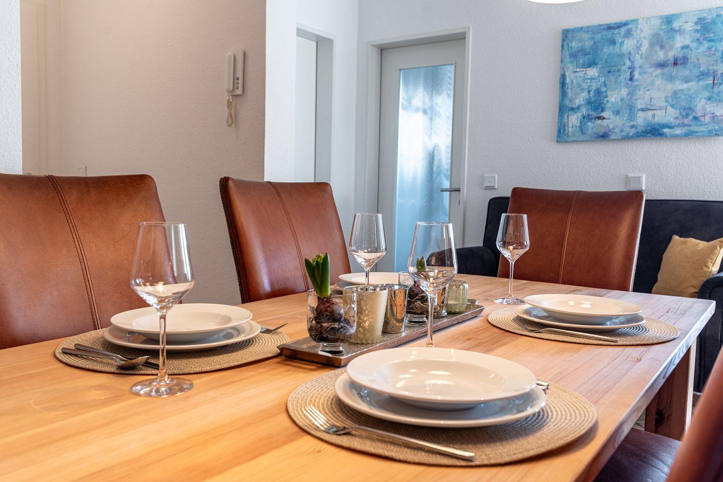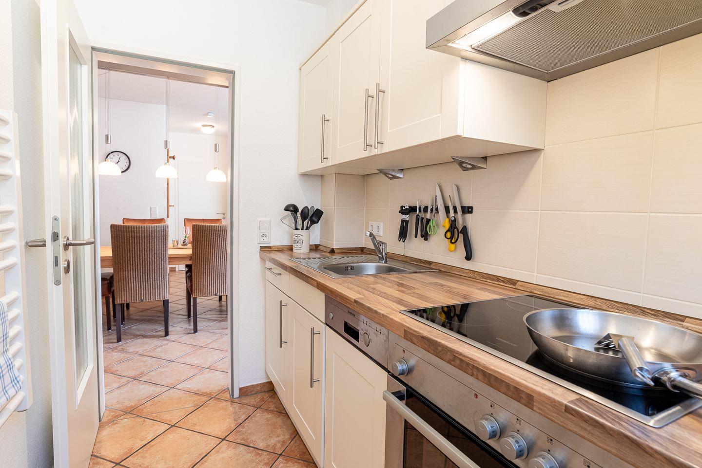 Die Ferienwohnung besticht durch ihre moderne Einrichtung und eine helle, freundliche Atmosphäre. Der offene Wohnbereich ist der perfekte Ort zum Entspannen und Verweilen. Hier finden Sie eine gemütliche Sitzecke, die zum Lesen oder gemeinsamen Spielen einlädt, sowie einen Essbereich, an dem Sie gesellige Mahlzeiten genießen können. Die voll ausgestattete Küche bietet alles, was Sie für die Zubereitung Ihrer Lieblingsgerichte benötigen.