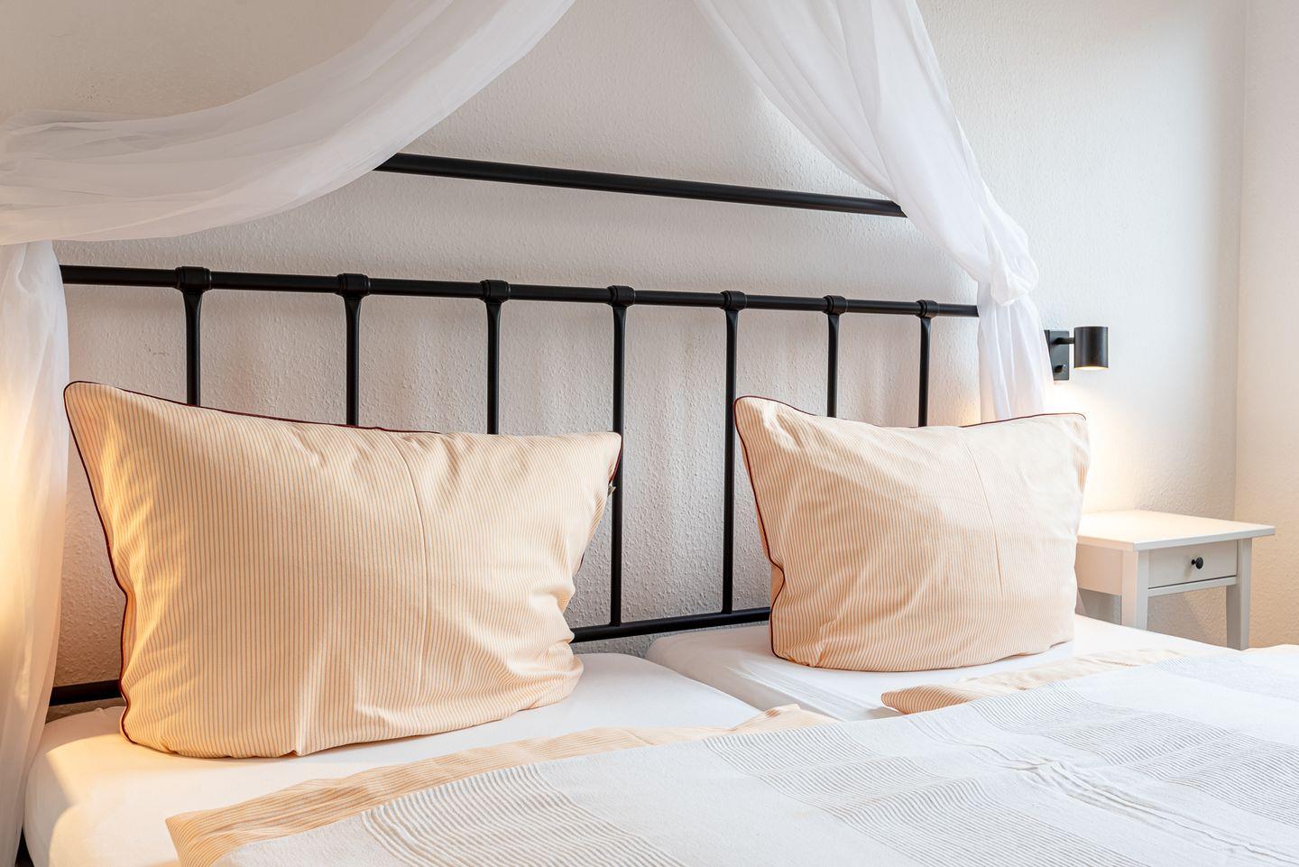 Unsere Wohnung "Klippenfänger" ist nordisch gradlinig mit allem Komfort und doch romantisch mit Himmelbett eingerichtet.