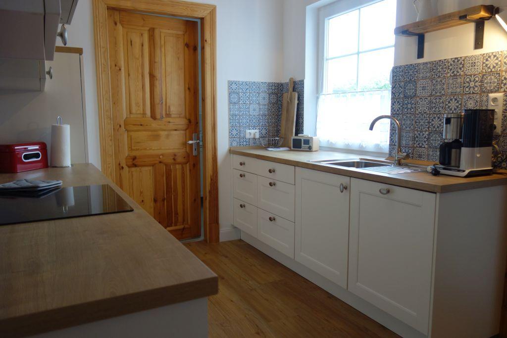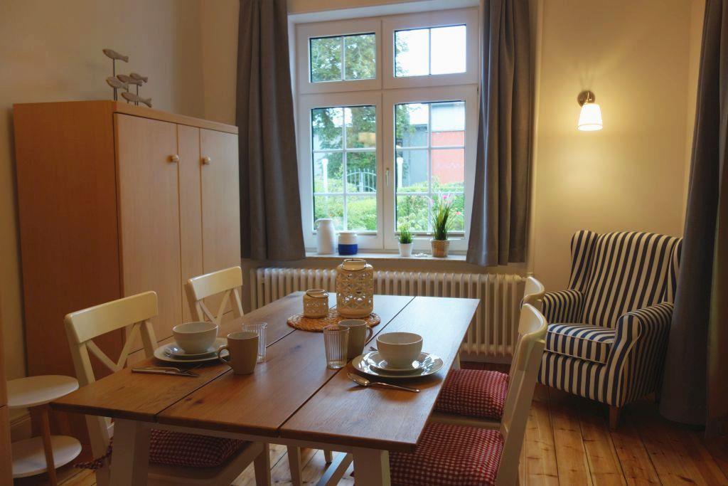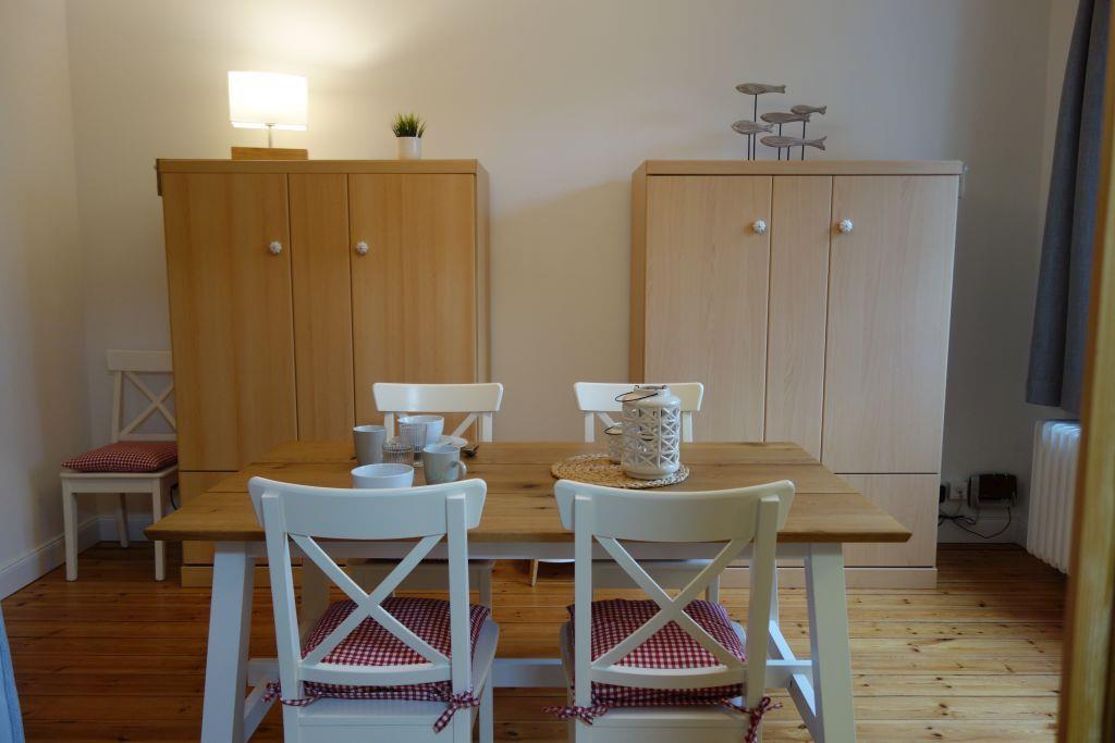Die Villa bietet alles, was das Herz begehrt: Ein gemütliches Wohnzimmer lädt zum Entspannen ein, während das angrenzende Esszimmer nicht nur Platz für gemeinsame Mahlzeiten bietet, sondern mit zwei komfortablen Schrankbetten (je 110 cm breit) zusätzliche Schlafmöglichkeiten schafft. Das separate Schlafzimmer, die voll ausgestattete Küche und das freundliche Duschbad sind harmonisch in hellen Weiß- und Naturholztönen gestaltet und tragen zum lichtdurchfluteten Ambiente bei. Ein besonderes Highlight: Viele der originalen Zimmertüren sowie der originale Holzfußboden konnten erhalten bleiben, wodurch der nostalgische Charme des Hauses bewahrt wurde. Die gelungene Mischung aus Alt und Neu macht die Villa Hansson zu einem ganz besonderen Rückzugsort.