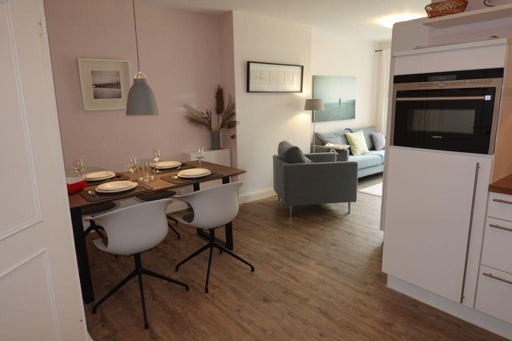 Das Herzstück der Wohnung ist der einladende Wohnbereich, der offen zur voll ausgestatteten, modernen Küche gestaltet ist. Hier finden Sie alles, was Sie für die Zubereitung kulinarischer Köstlichkeiten benötigen: einen Cerankochfeldherd, einen Backofen, eine Spülmaschine und sogar eine Kaffeemaschine für Ihre morgendlichen Genussmomente. Genießen Sie Ihre Mahlzeiten in der gemütlichen Essecke, die Platz für die ganze Familie bietet.