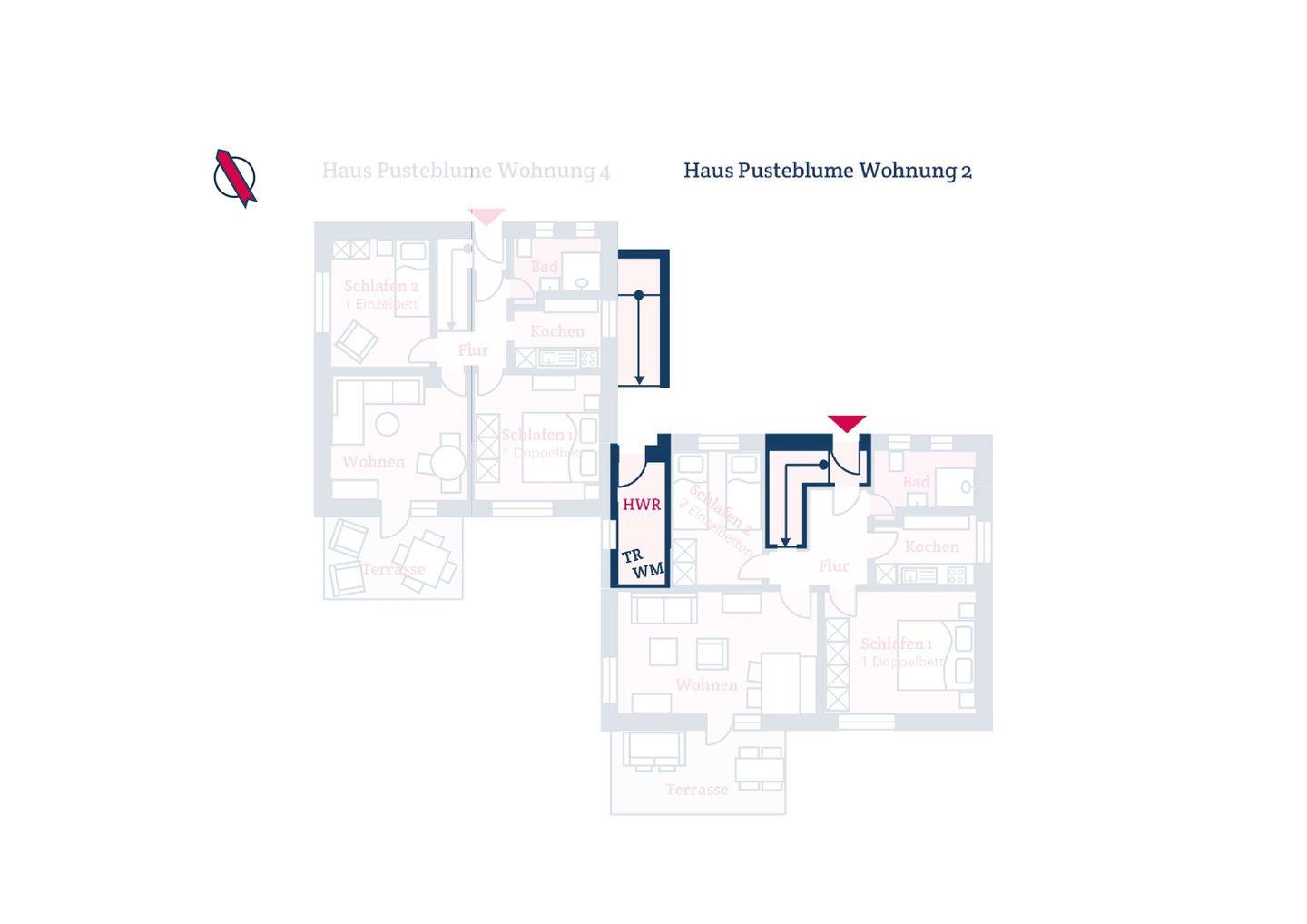 Die Ferienwohnung 2 im Haus Pusteblume verfügt über 3 Schlafzimmer und 1 Bad und bietet somit komfortabel Platz für bis zu 5 Personen zuzüglich einer Kleinkinderaufbettung. Auch bis zu 2 Hunde sind hier herzlich willkommen.