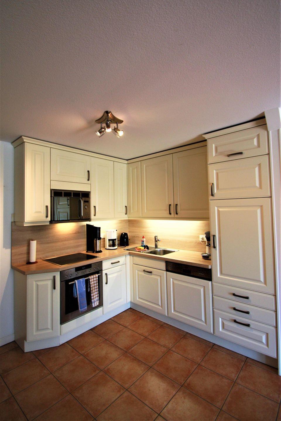 Der Wohnbereich ist als Wohnzimmer mit offen zum Wohnzimmer gestalteter Küche angelegt und lädt zum gemeinsamen Kochen, Essen und Verweilen ein. Zur Küchenausstattung gehören ein 4-Platten-Herd mit Backofen, Mikrowelle, Kühlschrank mit Gefrierfach, Spülmaschine sowie Kaffeemaschine, Wasserkocher, Toaster und umfangreiche Küchenutensilien inklusive Geschirr und Besteck. Ein Esstisch mit Essbereich ist vorhanden. Für gemütliche Stunden steht ein Kaminofen zur Verfügung; außerdem sind TV und Radio vorhanden. WLAN/Internet ist ebenfalls verfügbar.