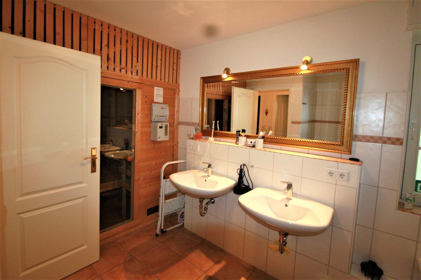 Insgesamt stehen 2 Badezimmer zur Verfügung, einmal mit Dusche, einmal mit Badewanne. Praktisch für längere Aufenthalte: Waschmaschine und Trockner können gemeinschaftlich genutzt werden (gegen Gebühr); Bügeleisen und Bügelbrett sind ebenfalls vorhanden.