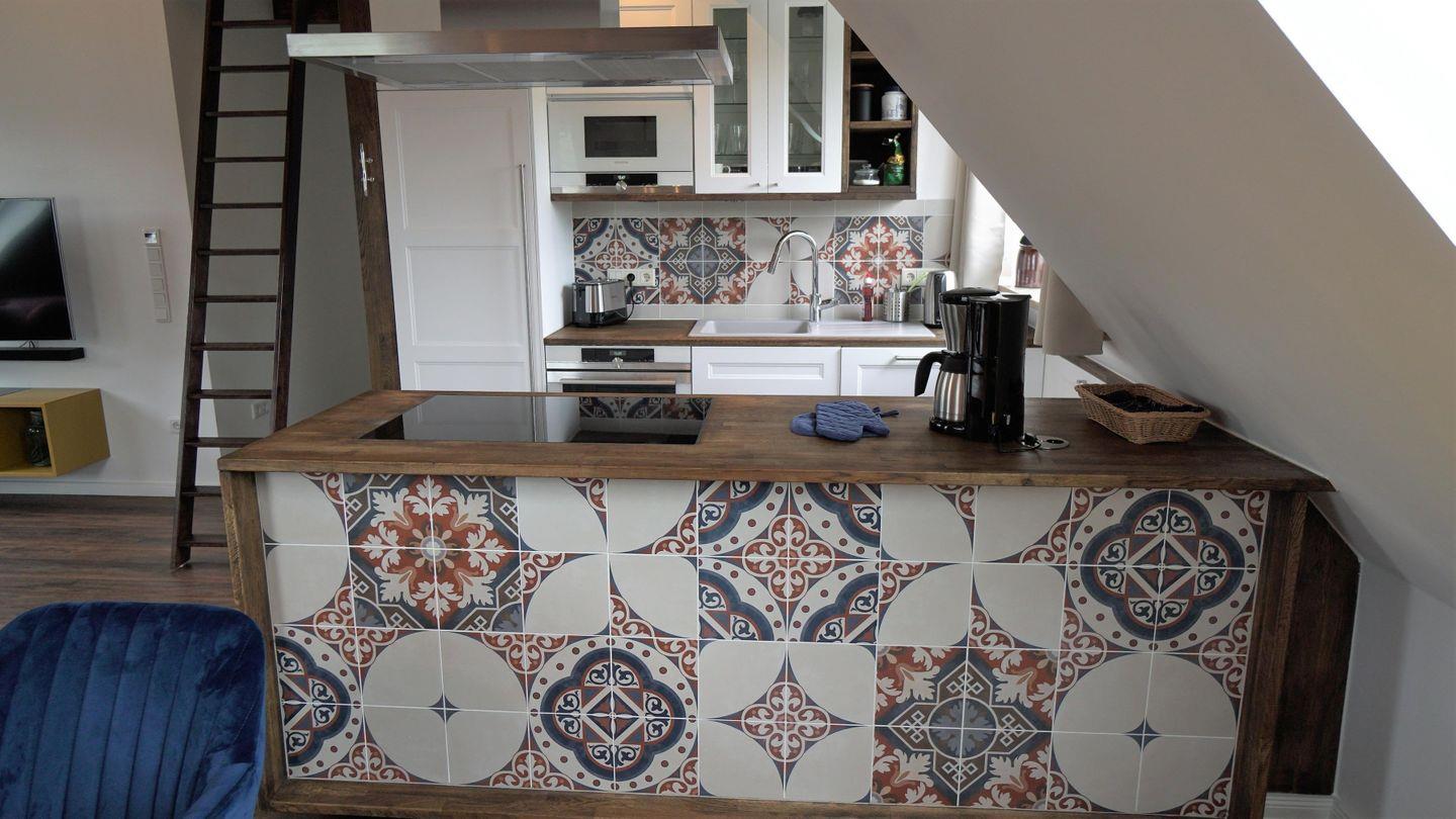 Die Küche ist offen zum Wohnzimmer gestaltet und voll ausgestattet: Herd mit 4-Platten-Kochfeld, Backofen und Mikrowelle stehen ebenso bereit wie Kühlschrank mit Gefrierfach im Kühlschrank. Spülmaschine, Kaffeemaschine, Wasserkocher und Toaster sowie Küchenutensilien, Geschirr und Besteck ermöglichen eine unkomplizierte Selbstversorgung.