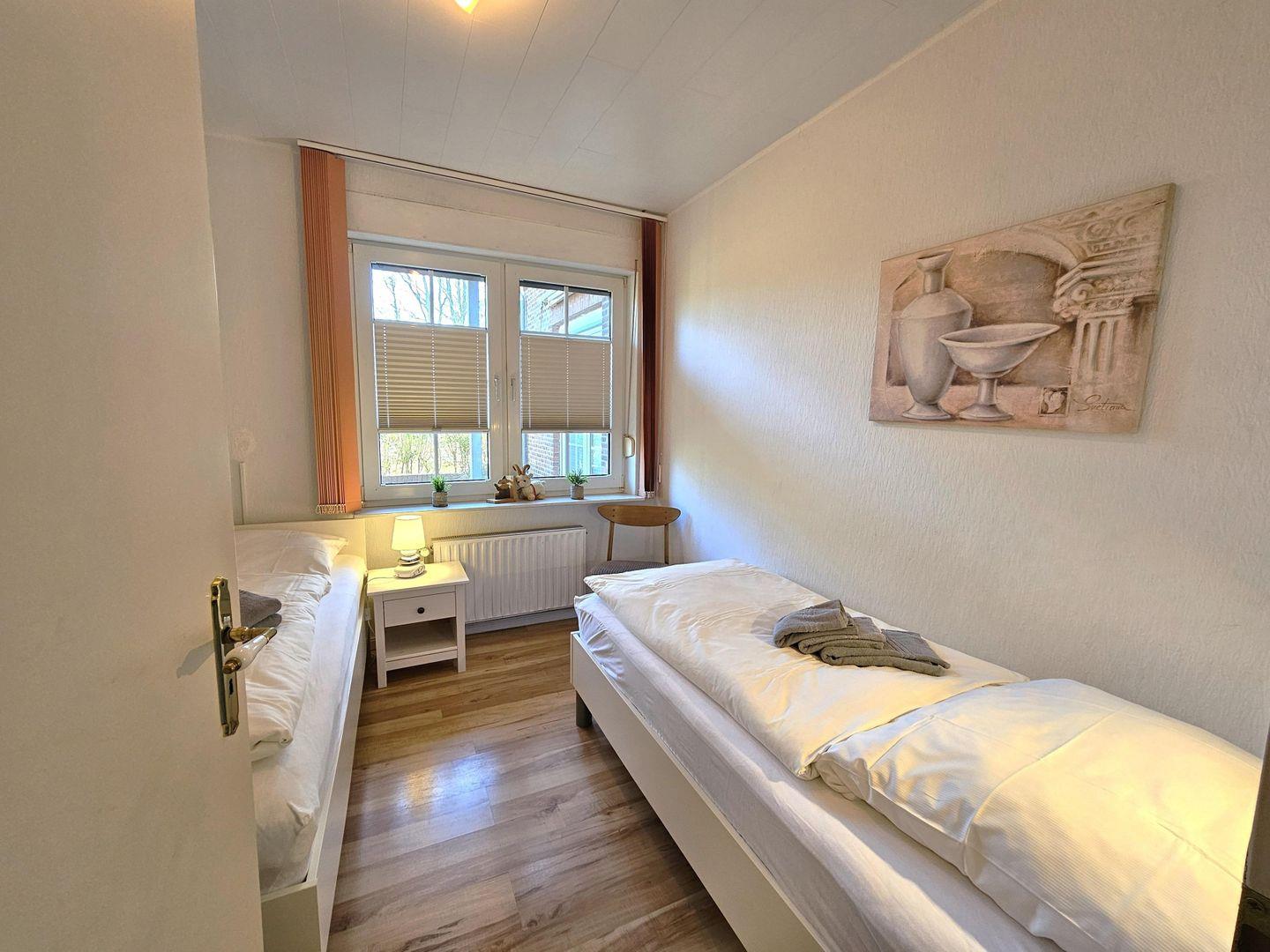 Austernfischer: allergikerfreundliche, rauchfreie 65-m²-Ferienwohnung im Hochparterre 2 Schlafzimmern und Platz für bis zu 4 Personen. Offene Küche zum Wohnzimmer mit 4-Platten-Herd, Backofen, Mikrowelle, Spülmaschine sowie Kaffeemaschine. WLAN, TV und Radio vorhanden. Terrasse und kostenloser Privatparkplatz (1). Strand und Meer ca. 350 m, Stadt ca. 850 m.
