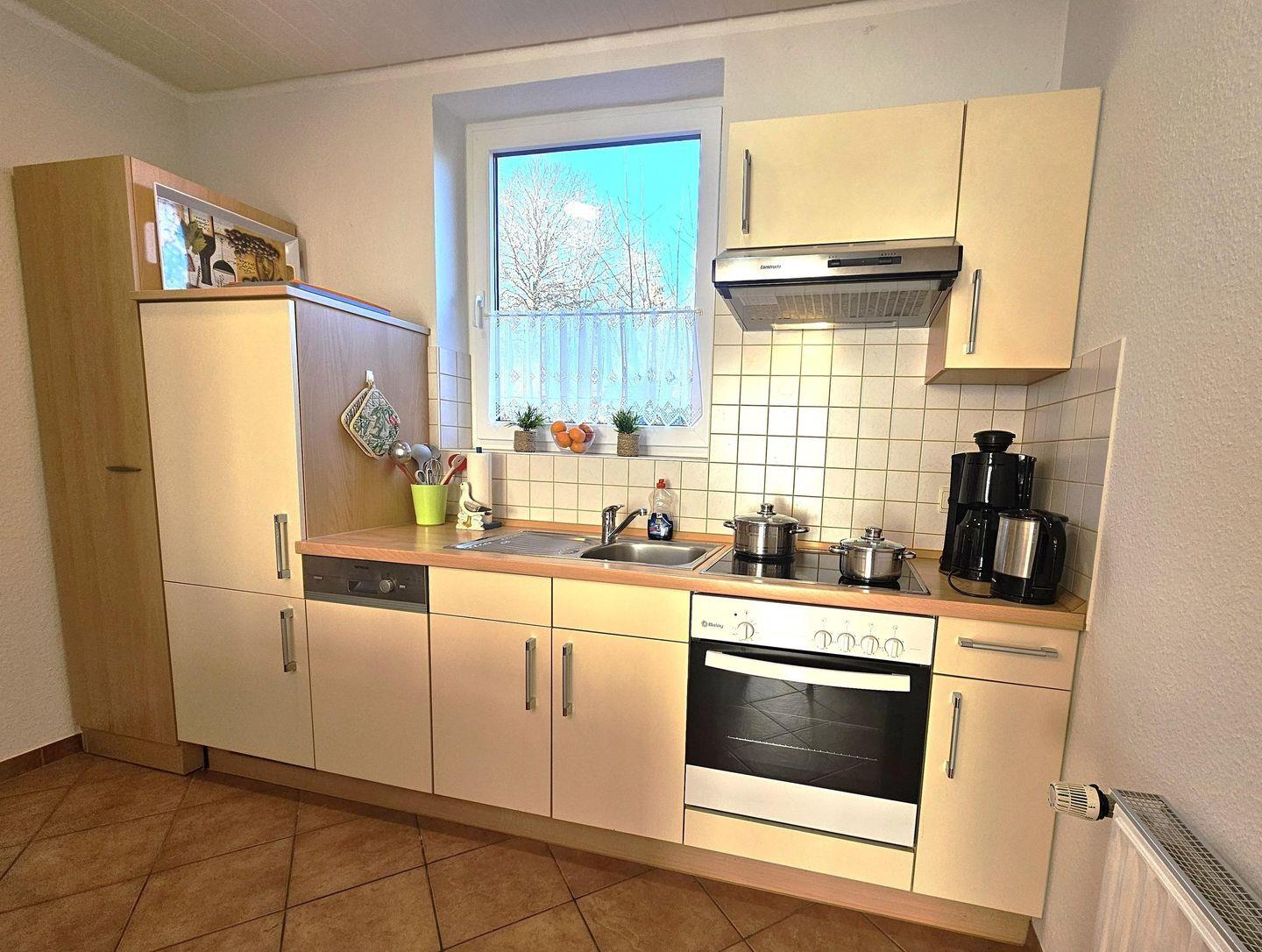 Die offene Küche ist zum Wohnzimmer hin gestaltet und bietet eine umfangreiche Ausstattung für die Selbstversorgung: Herd mit 4-Platten-Kochfeld, Backofen, Mikrowelle, Kühlschrank mit Gefrierfach, Spülmaschine sowie Toaster, Wasserkocher und Kaffeemaschine. Geschirr, Besteck und Küchenutensilien sind vorhanden.