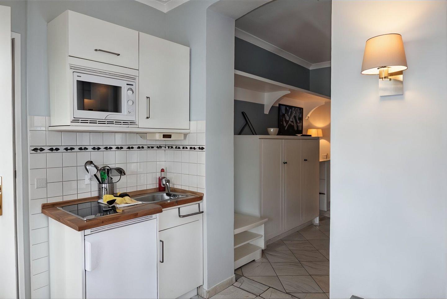 Die Kochnische ist funktional ausgestattet und bietet alles für die unkomplizierte Selbstversorgung: Herd mit 2-Platten-Kochfeld, Mikrowelle, Kühlschrank, Kaffeemaschine sowie Küchenutensilien, Geschirr und Besteck. Damit gelingen Frühstück, kleine Mahlzeiten und schnelle Abendessen ohne großen Aufwand.